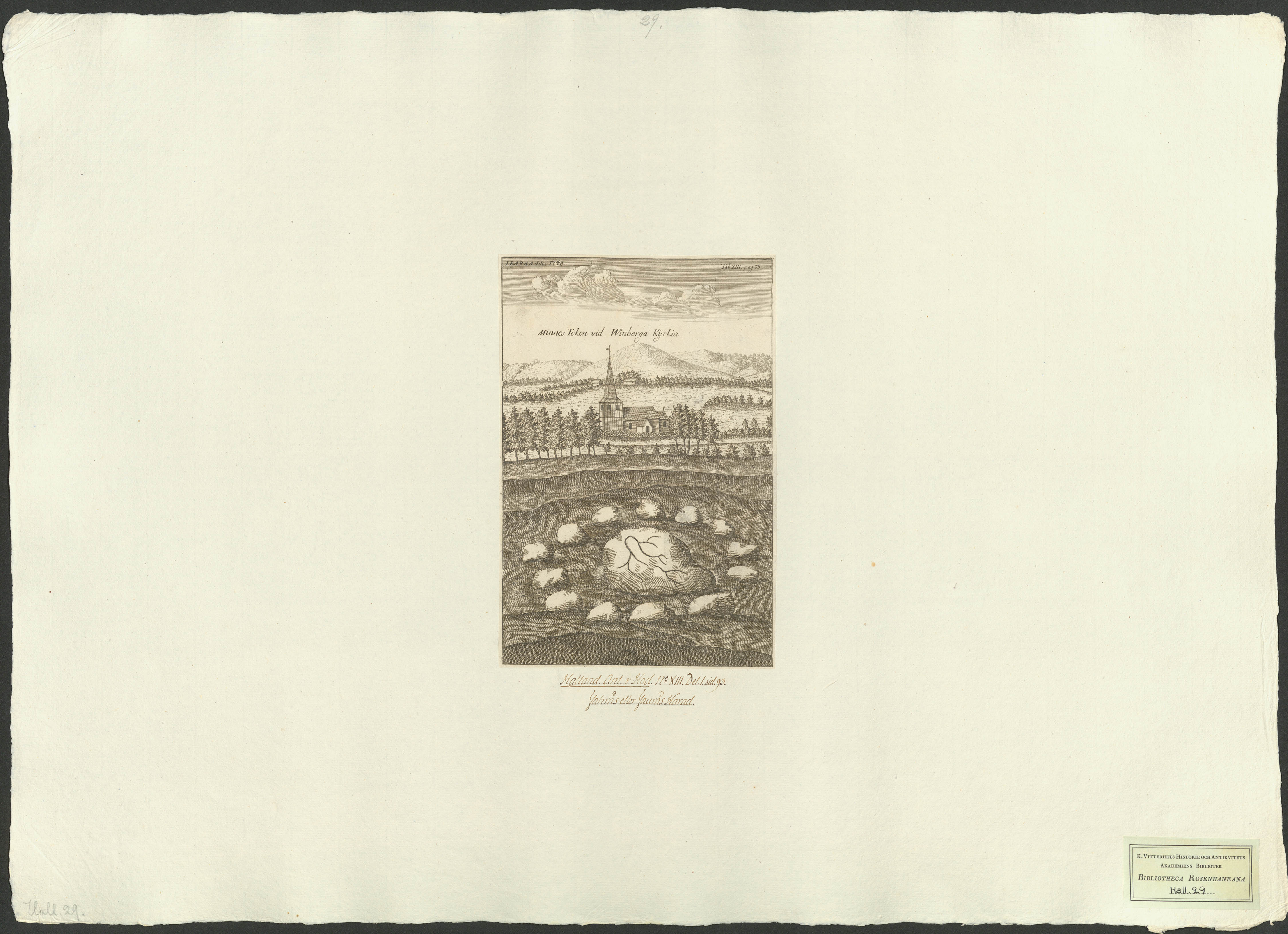 Beskrivning: 1 grafiskt bl. : I förgrunden en domarring, där bakom Vinberga kyrka. I. R. A. R. A. A. Delin A. 1748