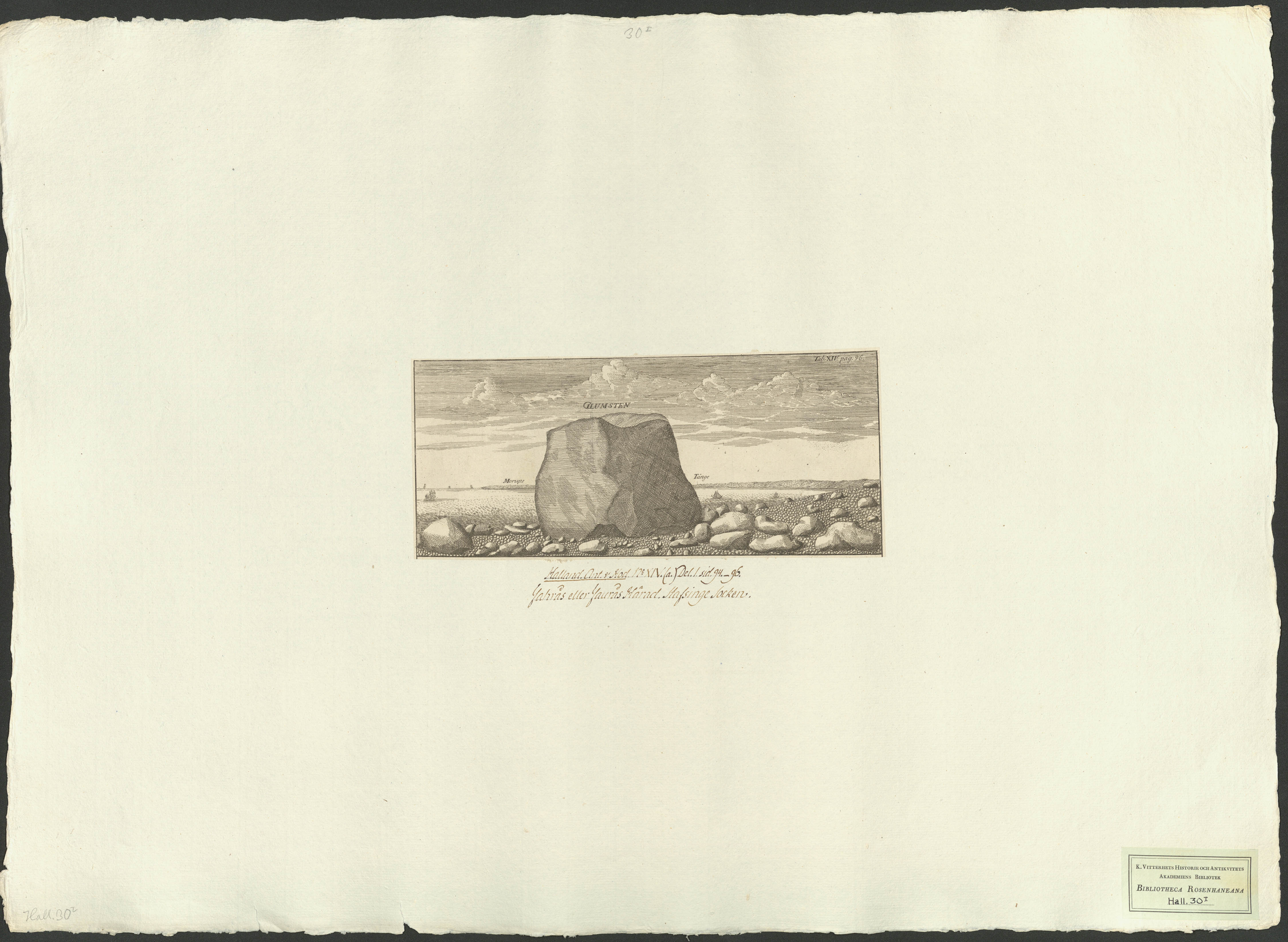 Beskrivning: 1 grafiskt bl. : En stor sten på stranden. I bakgrunden Morups tånge.