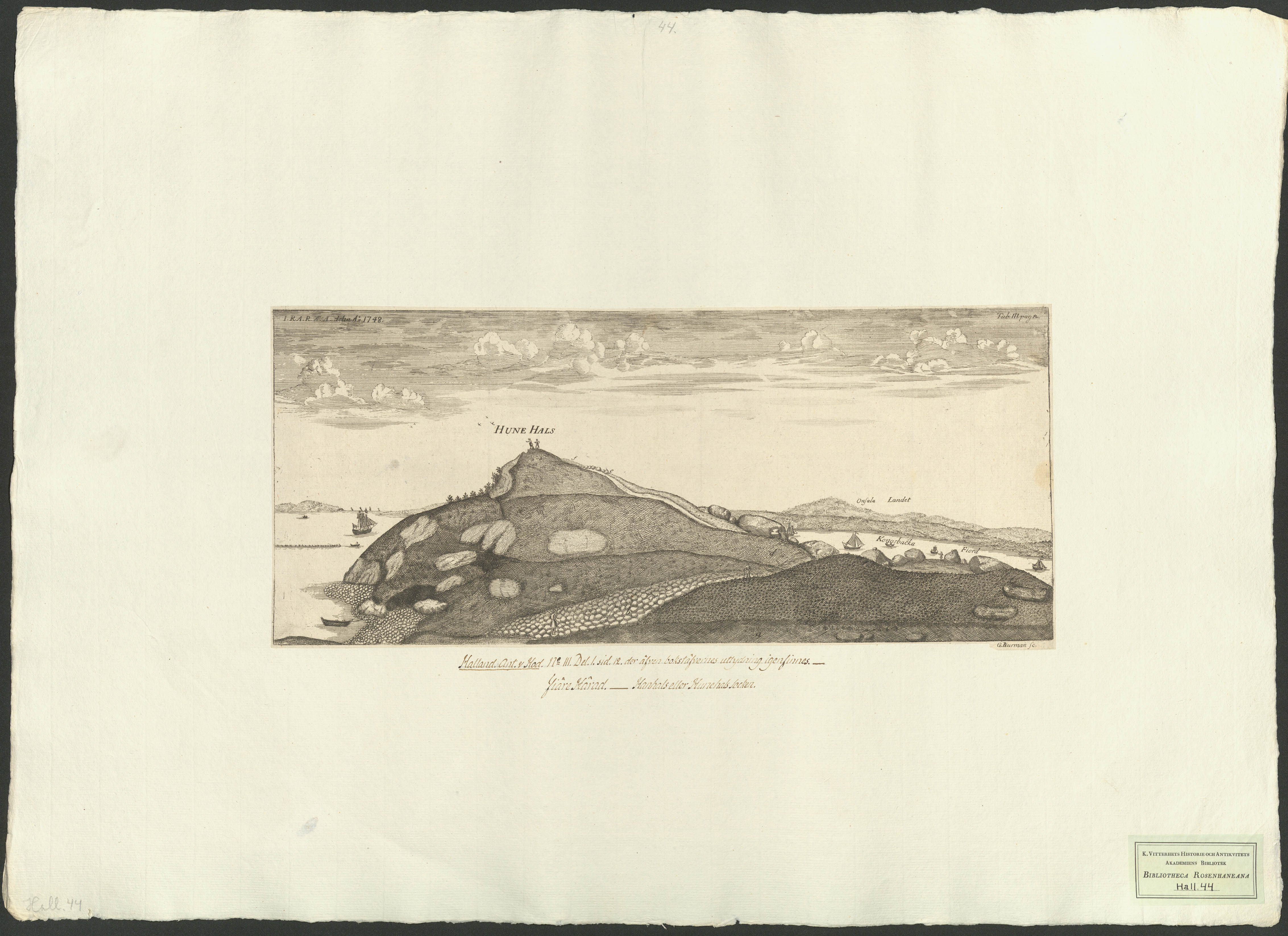 Beskrivning: 1 grafiskt bl. : Vy över ett kustlandskap. I. R. A. R. A. A. Delin A. 1748 ; C. Biurman sc.