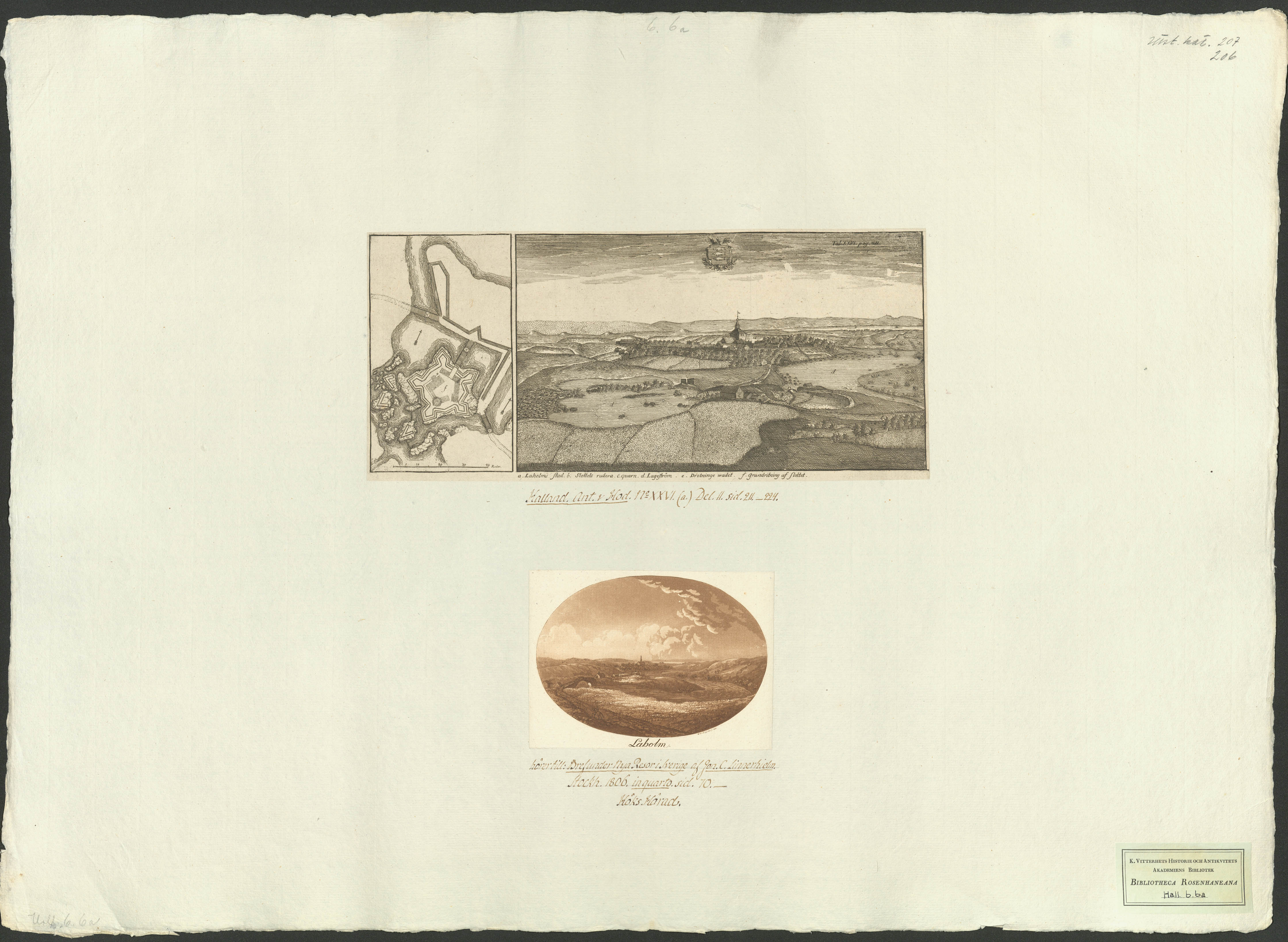 Beskrivning: 1 grafiskt bl. : Till vänster en stadsplan med skala i roder. Till höger en teckning i fågelperspektiv över staden med omnejd.