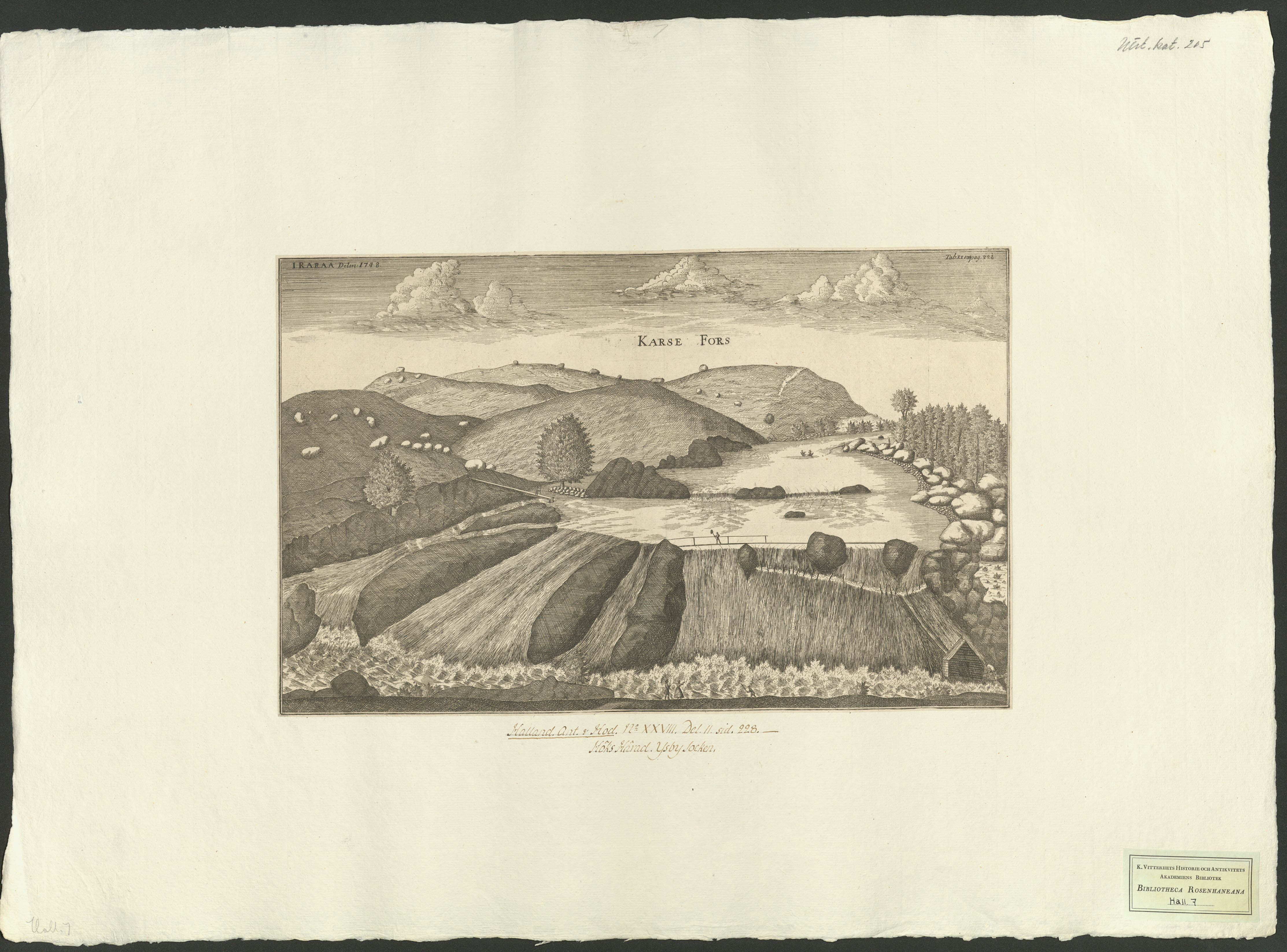 Beskrivning: 1 grafiskt bl. : Vy över forsen med omgivande kullar. I. R. A. R. A. A. delin 1748