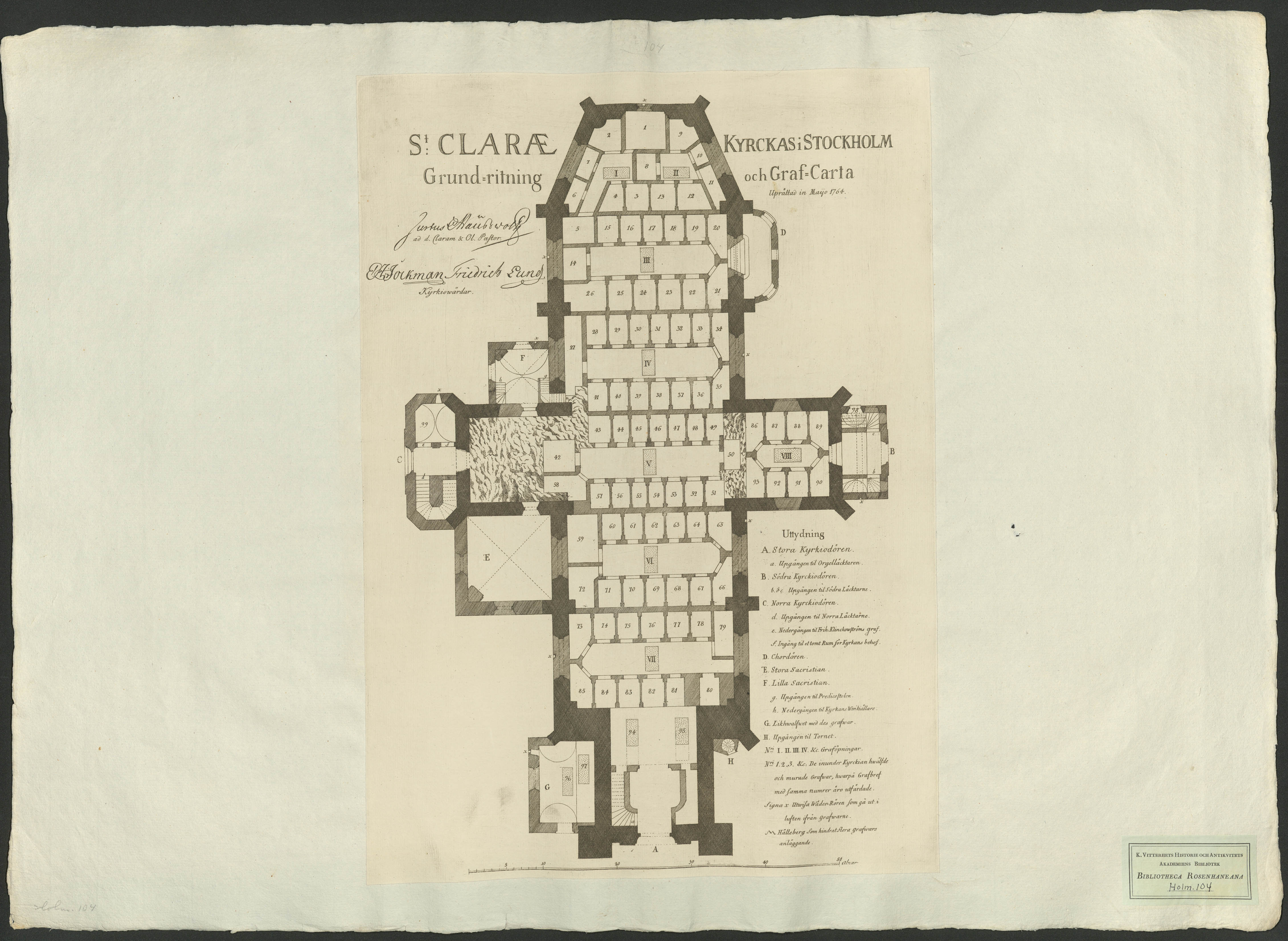 S:t Claræ kyrckas i Stockholm grundritning och graf-carta upprättad in Mayo 1764.[Bild]