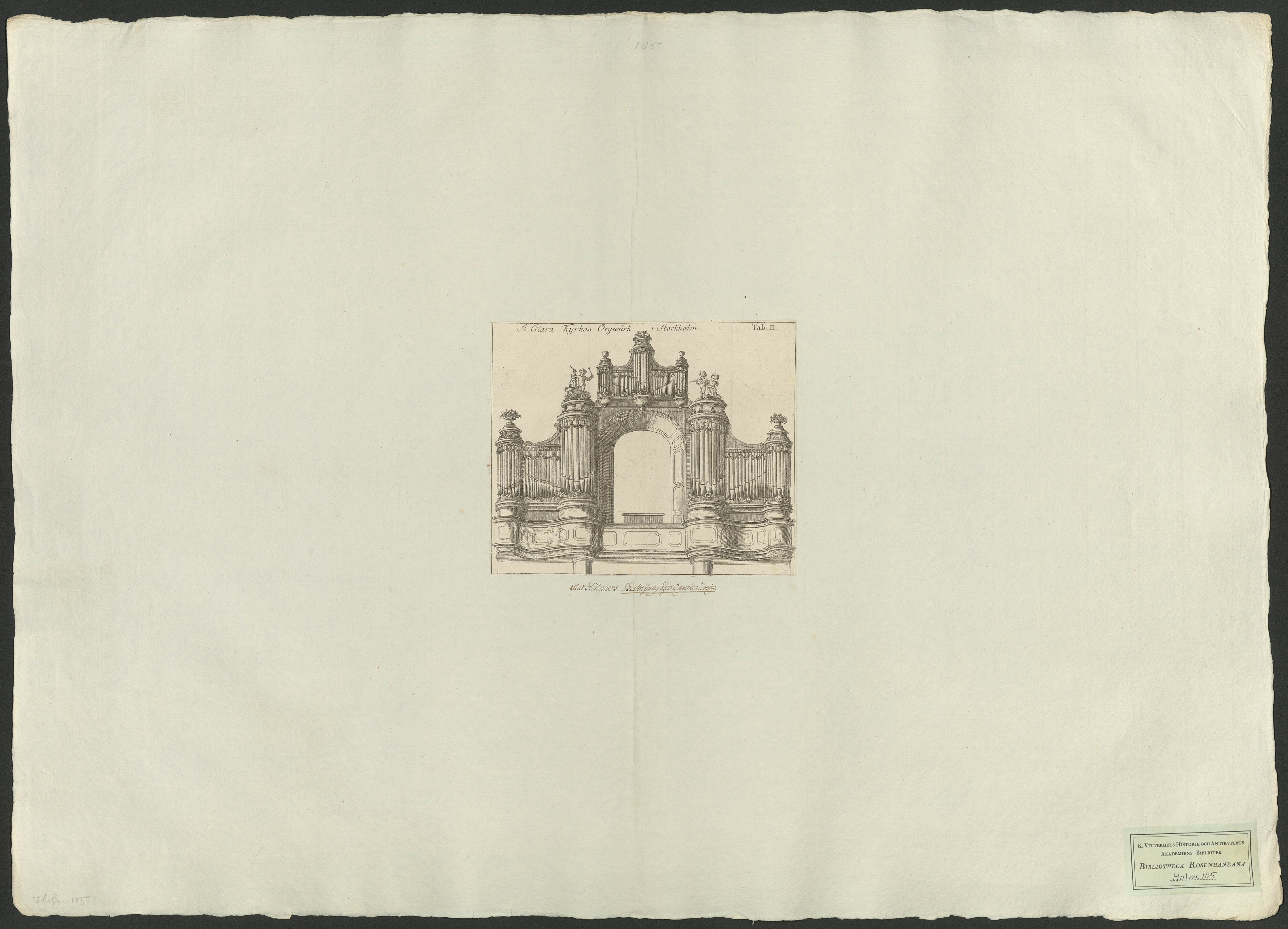 Beskrivning: 1 grafiskt bl. : Perspektivteckning av orgelns fasad.