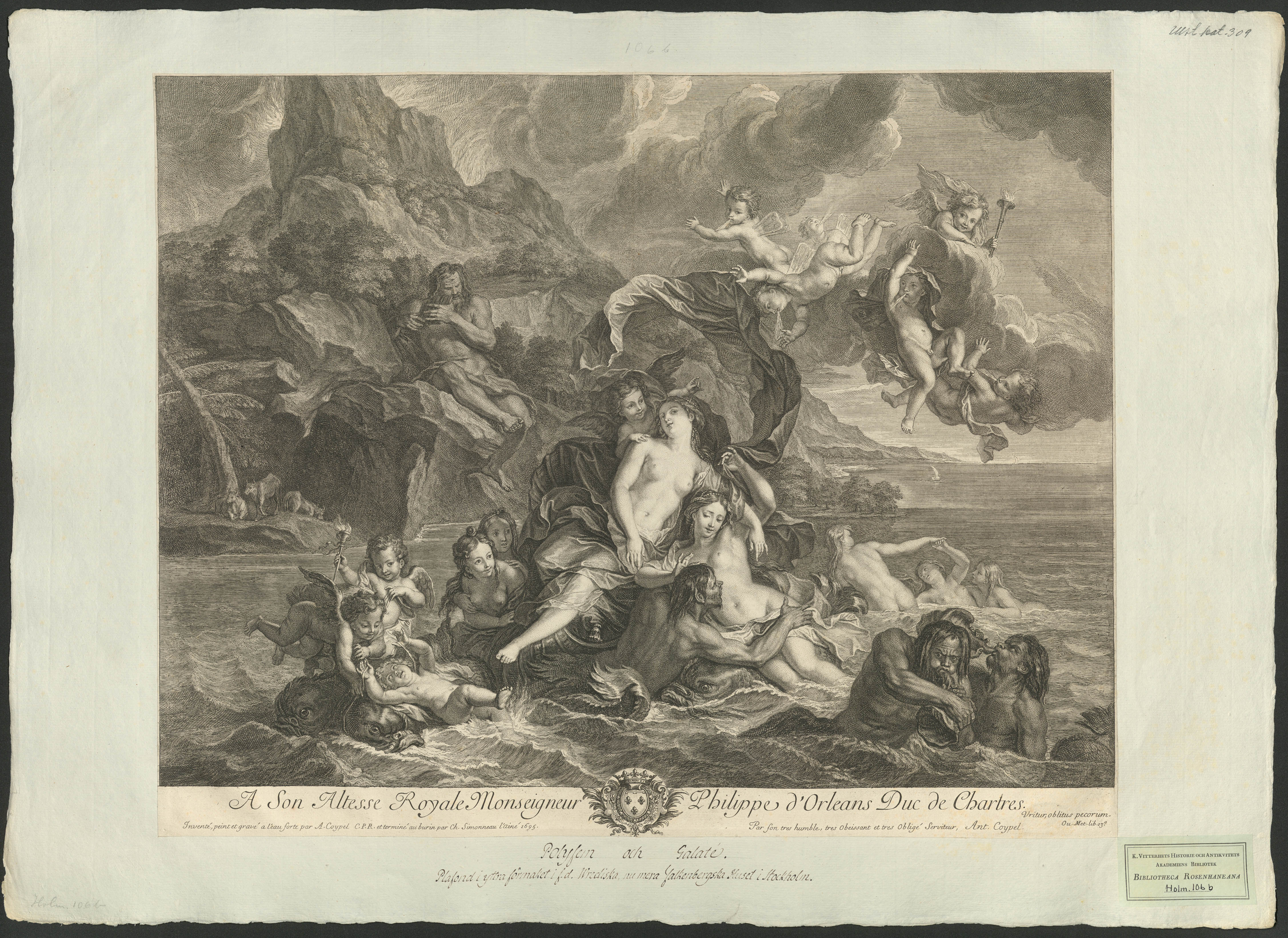 Beskrivning: 1 grafiskt bl. : Gudinnorna, omgivna av keruber, vilar på ett snäckskal på vågorna i ett allegoriskt landskap. "par A. Coypel ... et terminé au burin par Ch. Simonneau láiné 1695."