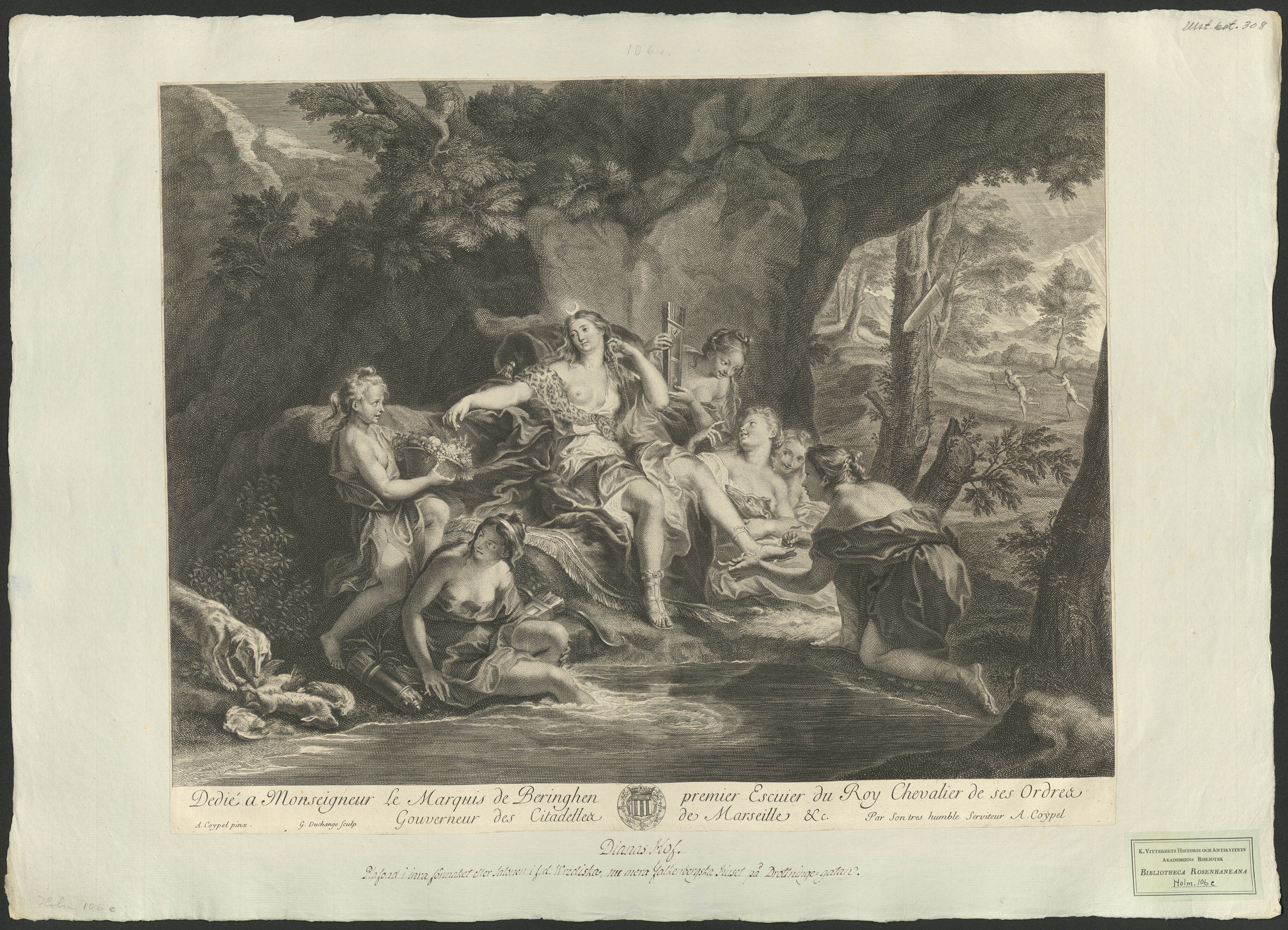 Beskrivning: 1 grafiskt bl. : Diana omgiven av uppvaktande hovdamer i ett allegoriskt landskap." "A. Coypel pinx. G. Duchange Sculp."