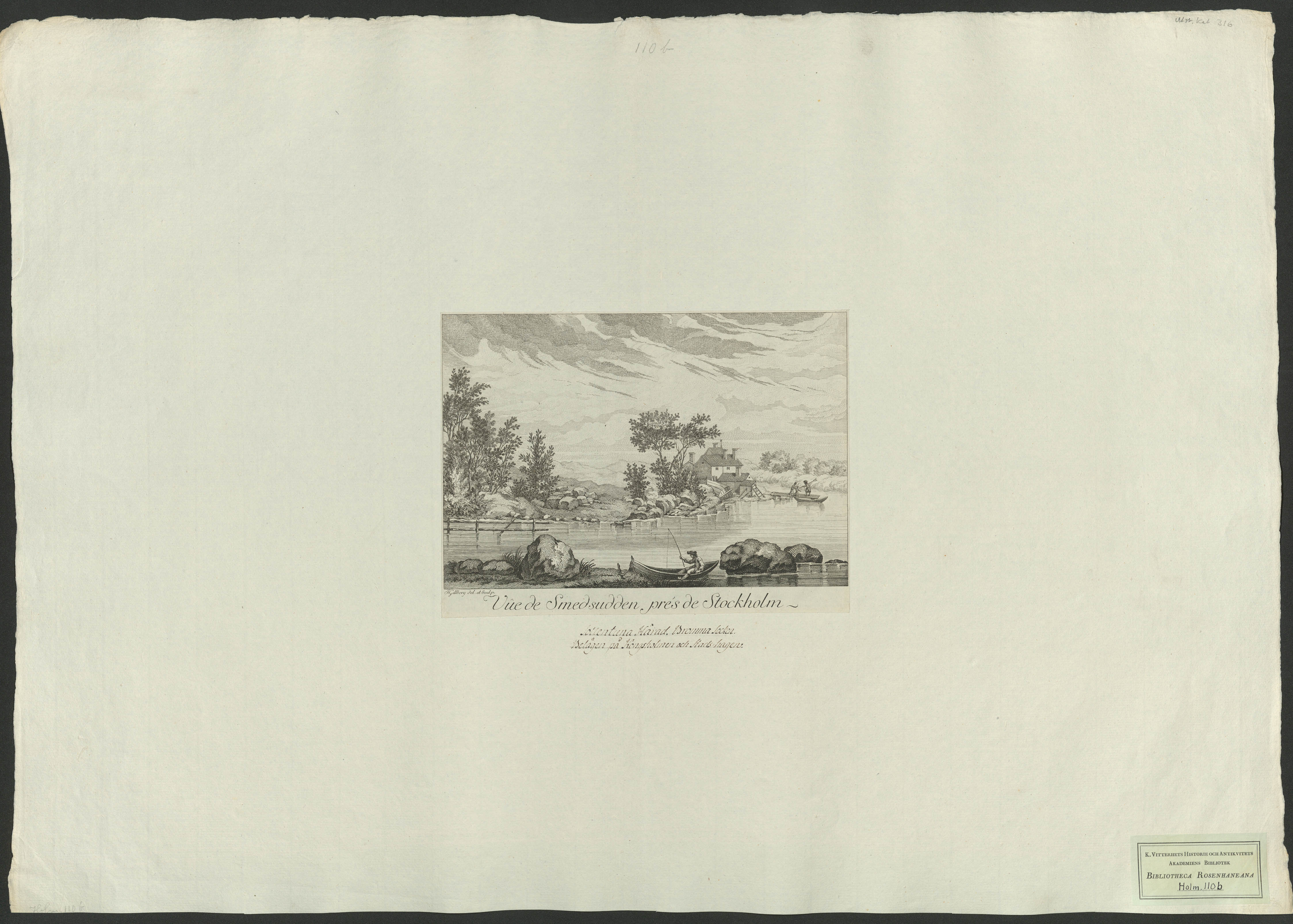 Beskrivning: 1 grafiskt bl. : Landskapsmotiv med Smedsudden i bakgrunden och en fiskare i en båt i förgrunden. J. Gillberg del. et Sculp.