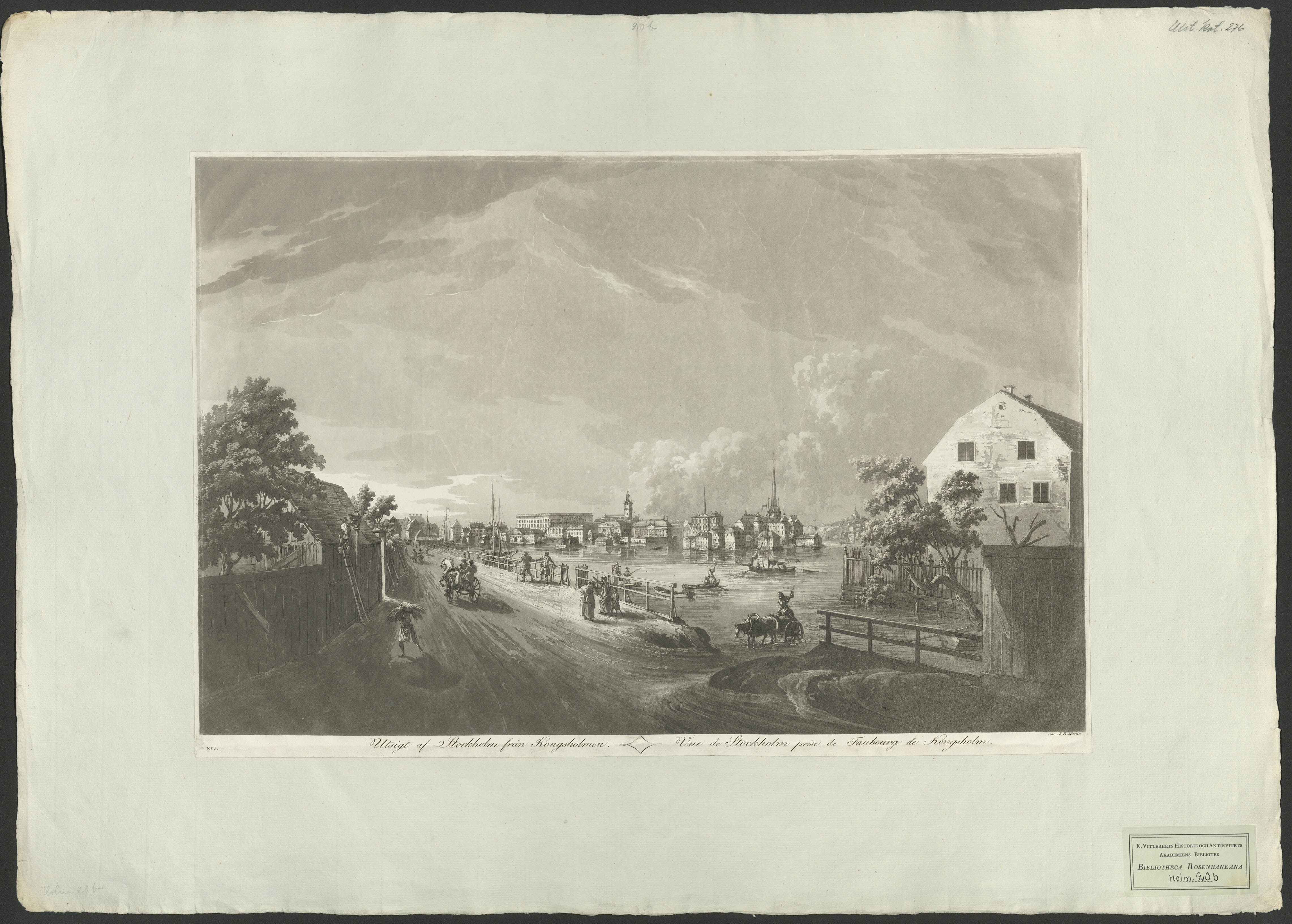 Beskrivning: 1 grafiskt bl. : I förgrunden en landsväg längs stranden, med folkliv. I bakgrunden Riddarholmen och Gamla stan med slottet. No 5. par J. F. Martin