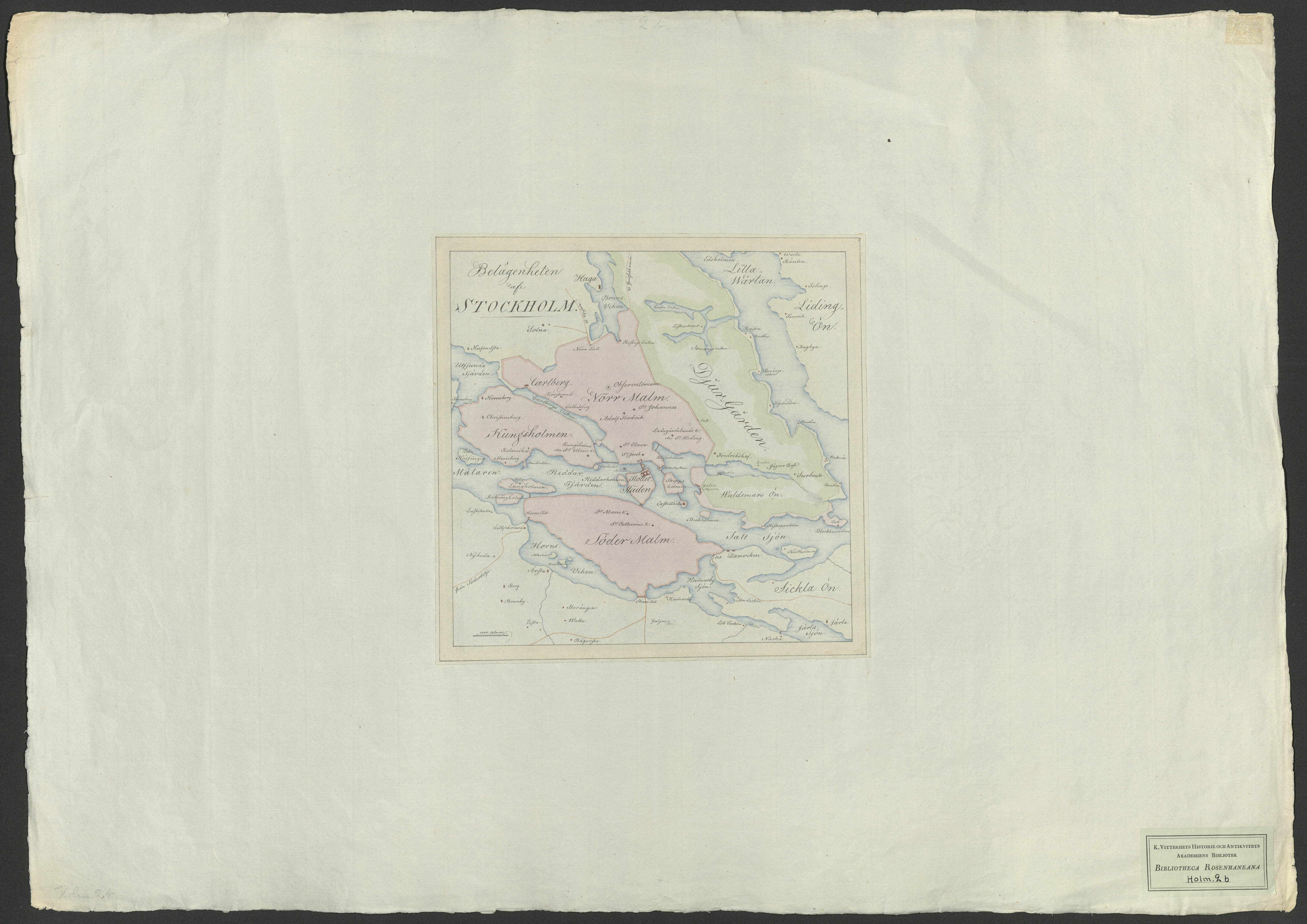 Beskrivning: 1 handritad karta : Stockholm med omgivningar. Staden i rosa. Djurgården i grönt. Visar kyrkor och större gårdar.