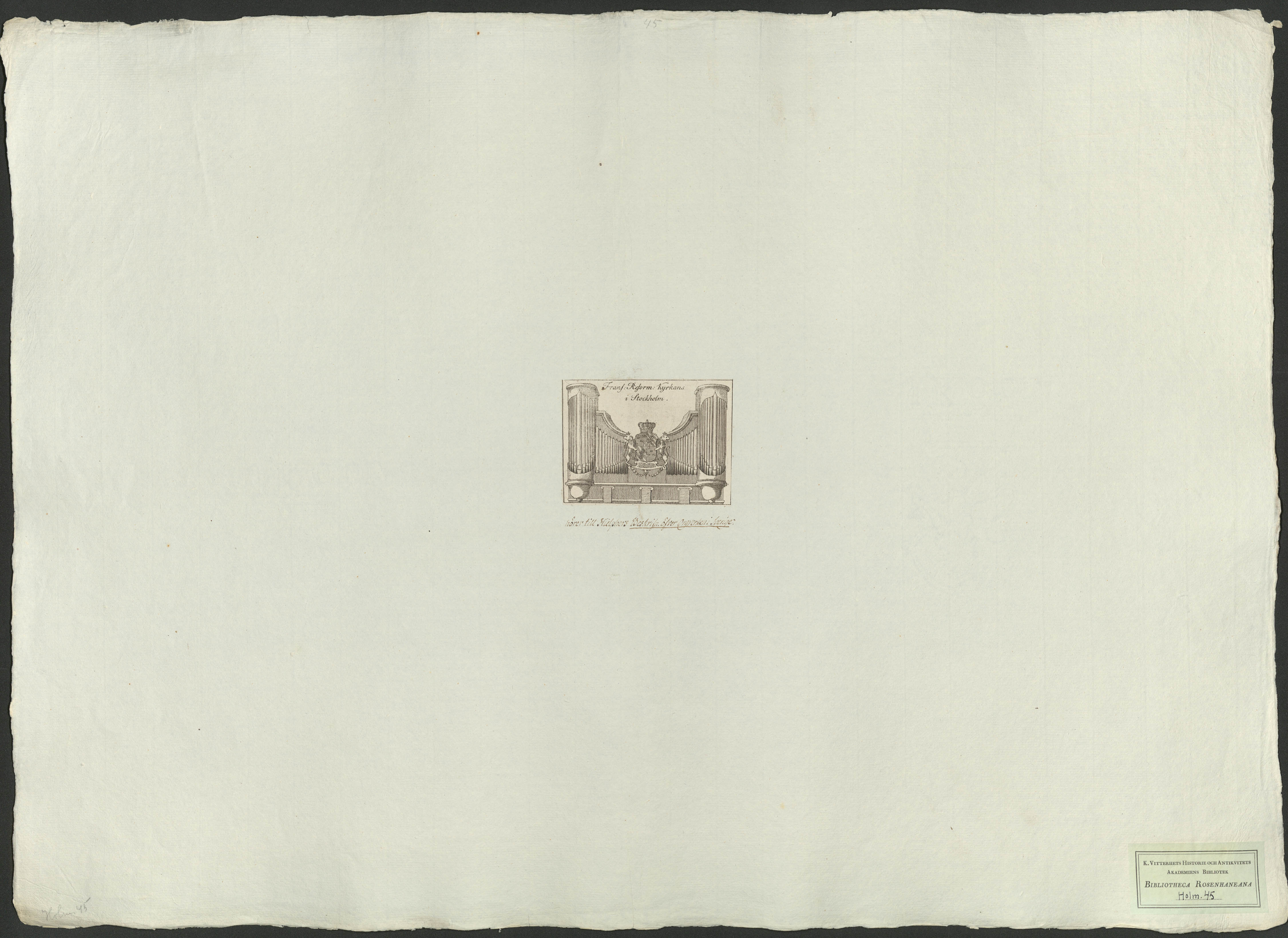 Beskrivning: 1 grafiskt bl. : Teckning av orgels framsida
