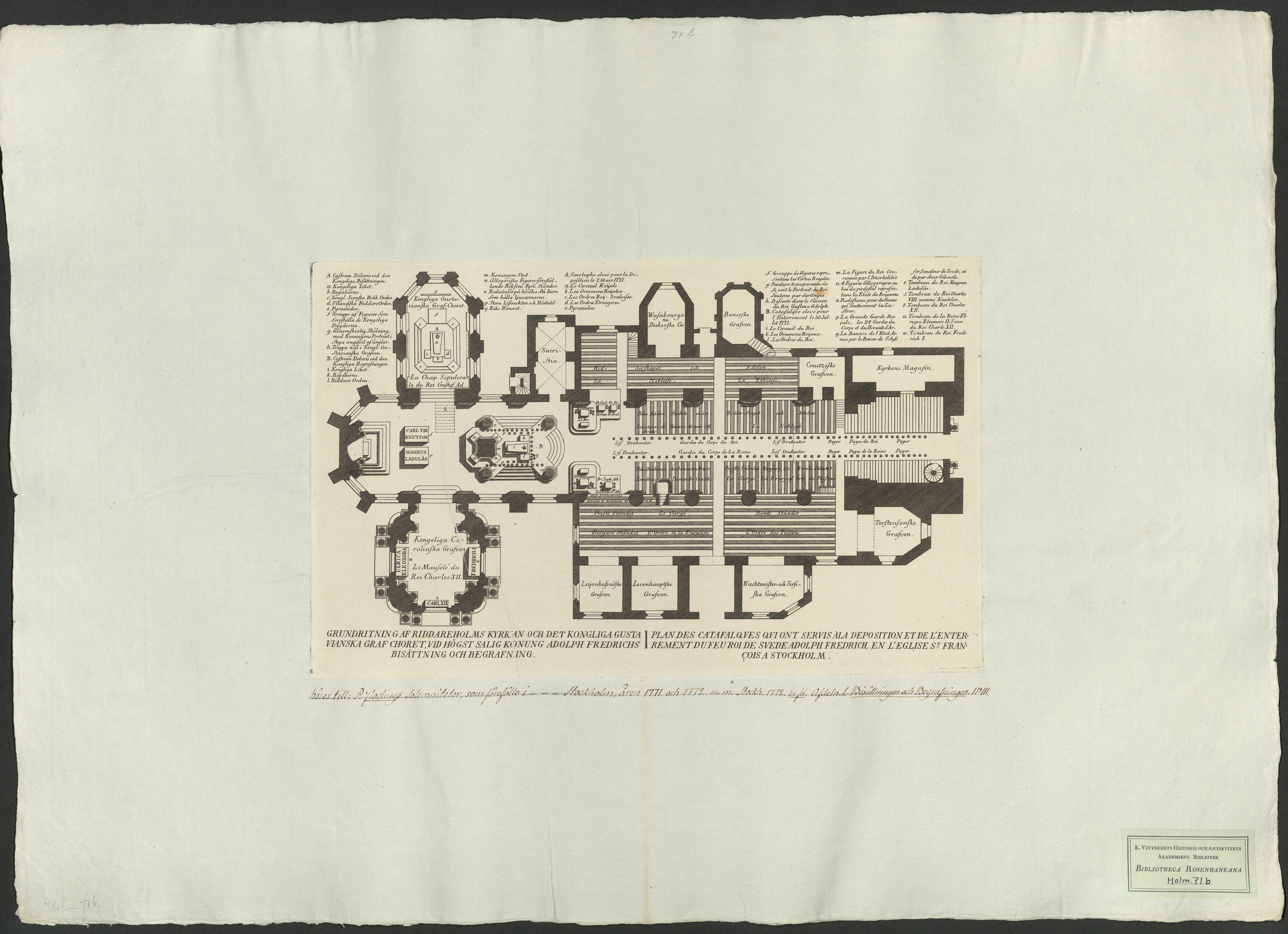 Beskrivning: 1 grafiskt bl. : Plan över kyrkan samt uppgifter om placeringen av den kungliga kistan, begravningsutensilierna, hedersvakten samt gästerna.