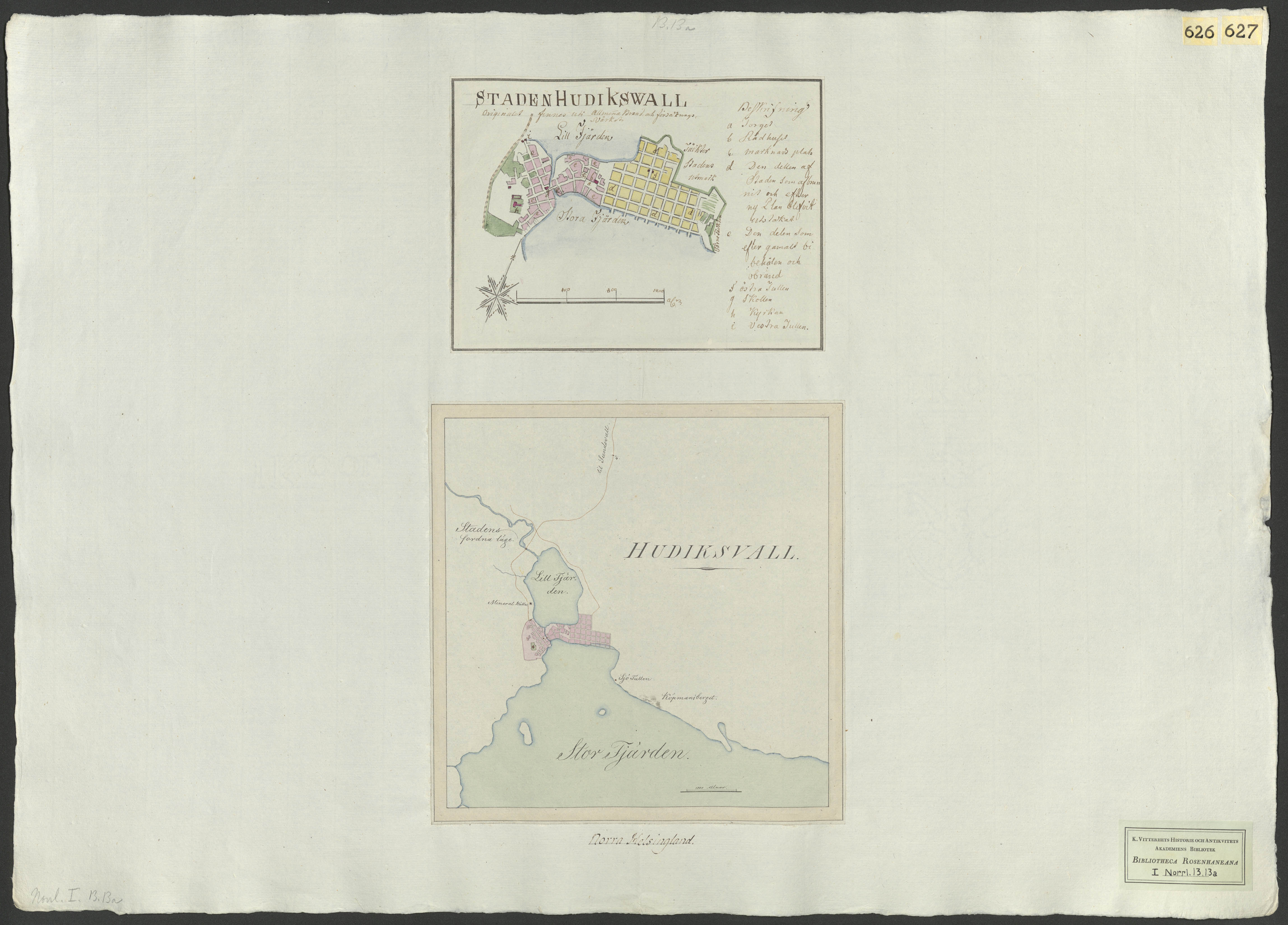 Beskrivning: 1 handritad karta : Kartan beskriver den gamla stadsdelen (rosa) och den nyuppförda i rutmönster (gul). Till höger en legend som upptar de viktigaste byggnaderna.;Skalstock. Skala 1 cm = ca 133 alnar.