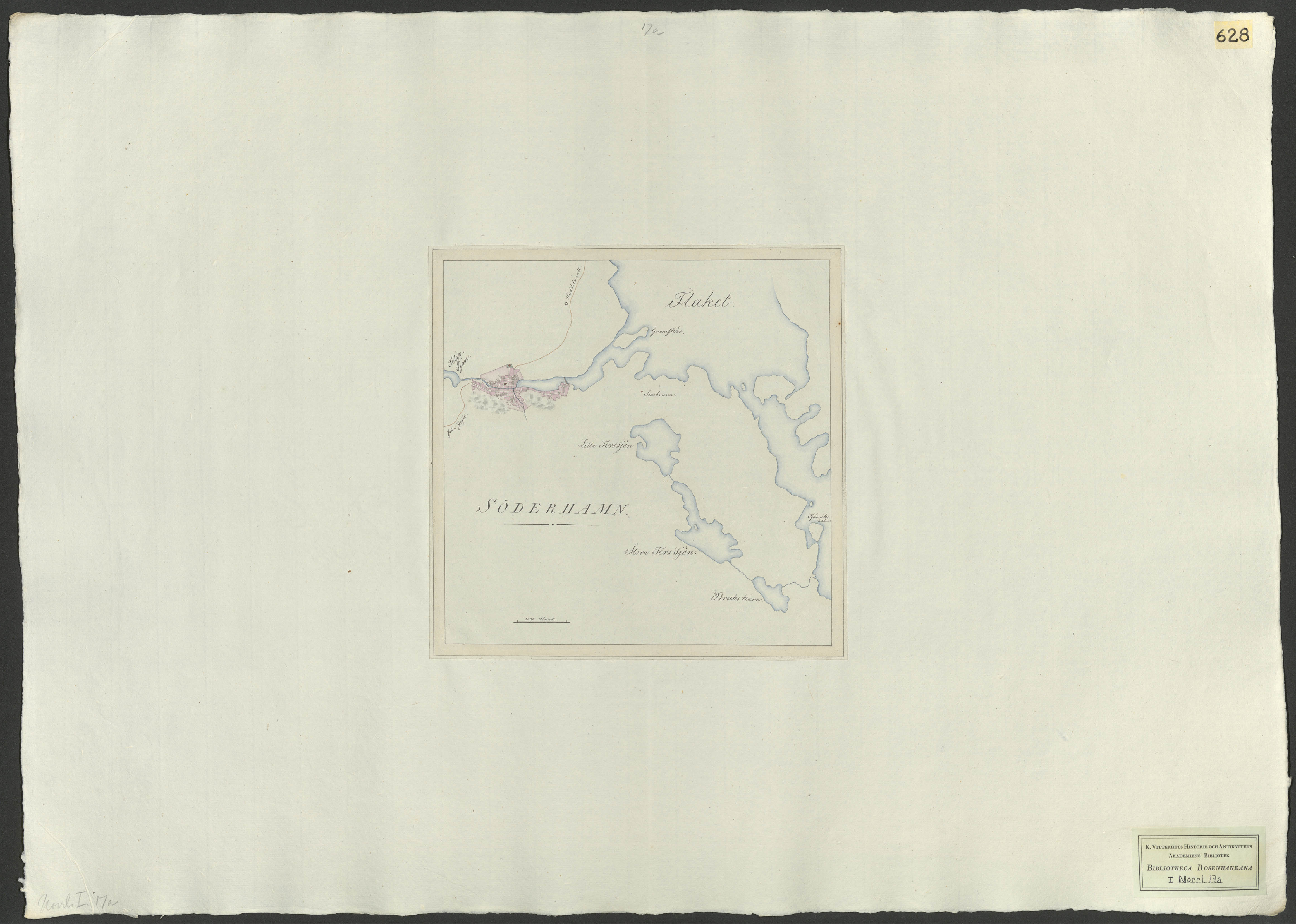 Beskrivning: 1 handritad karta : Visar stadens läge vid åmynningen och fjärden Flaket. Även stadskvarteren.