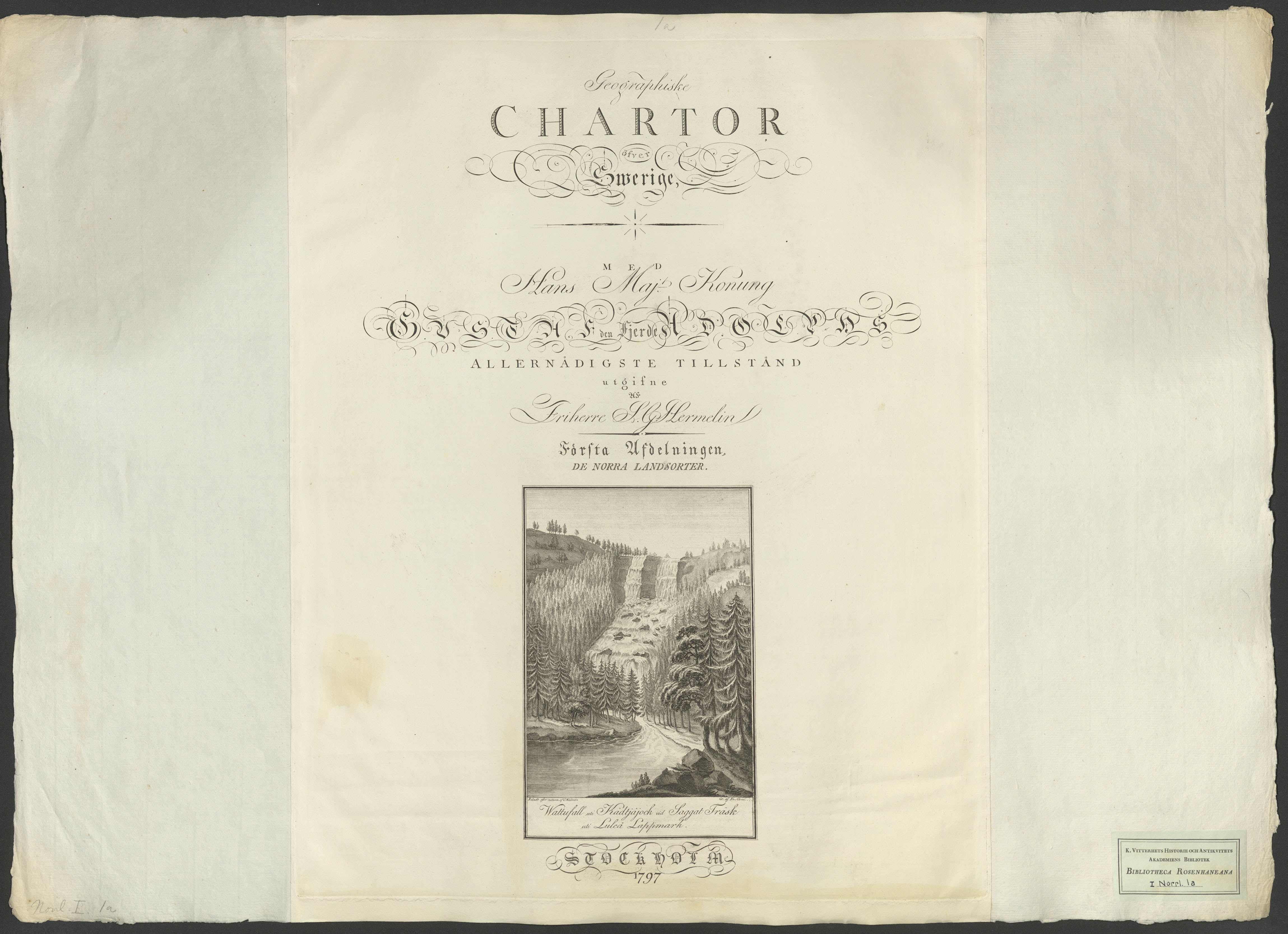 Beskrivning: 1 grafiskt bl. : Skogslandskap med vattenfall Fredrik Akrel