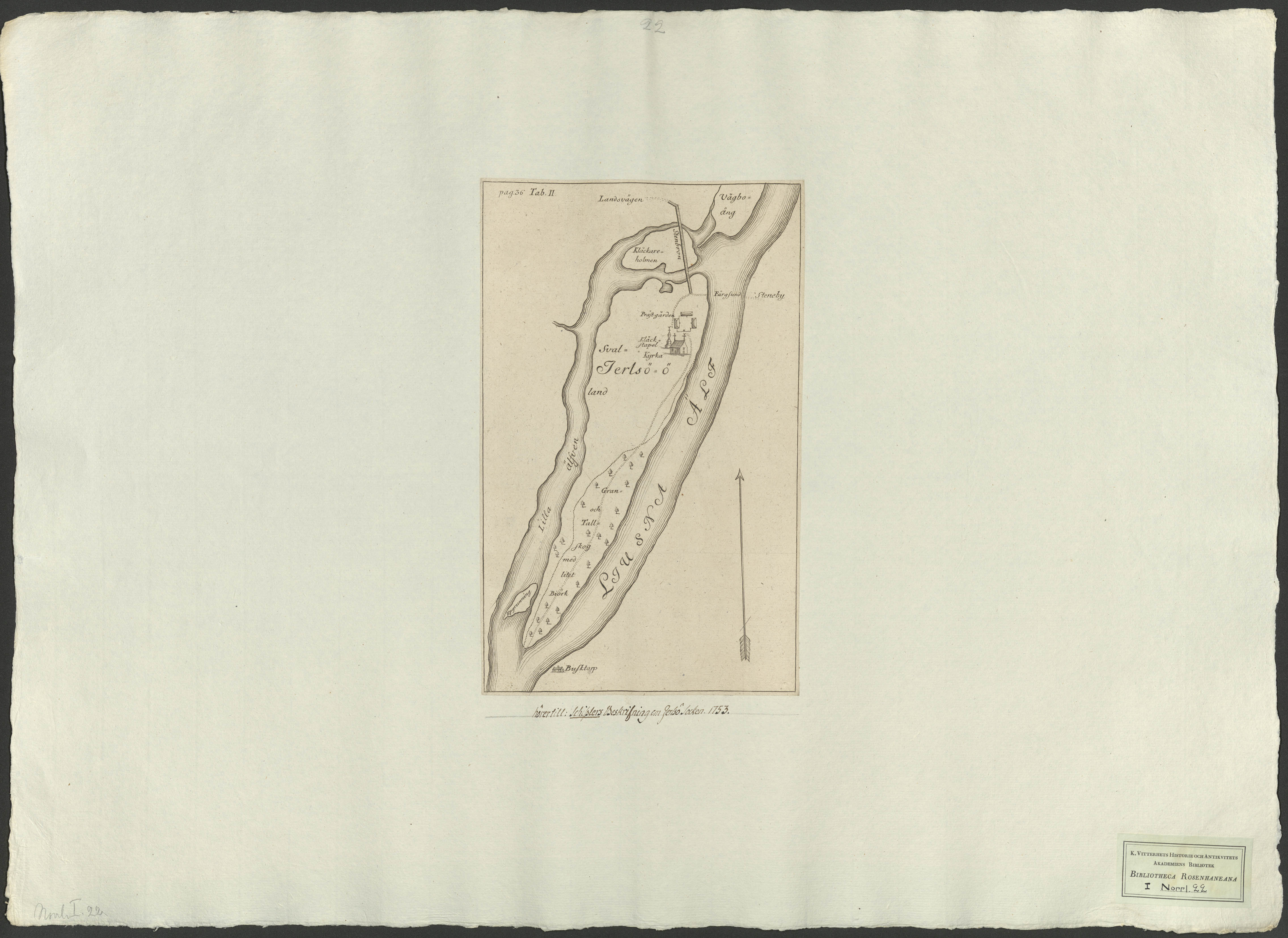 Beskrivning: 1 grafiskt bl. : Detalj av Järfsön och Klockarholmen i Ljusnan. Kyrka, klockstapel, prästgård, stenbro, landsväg.