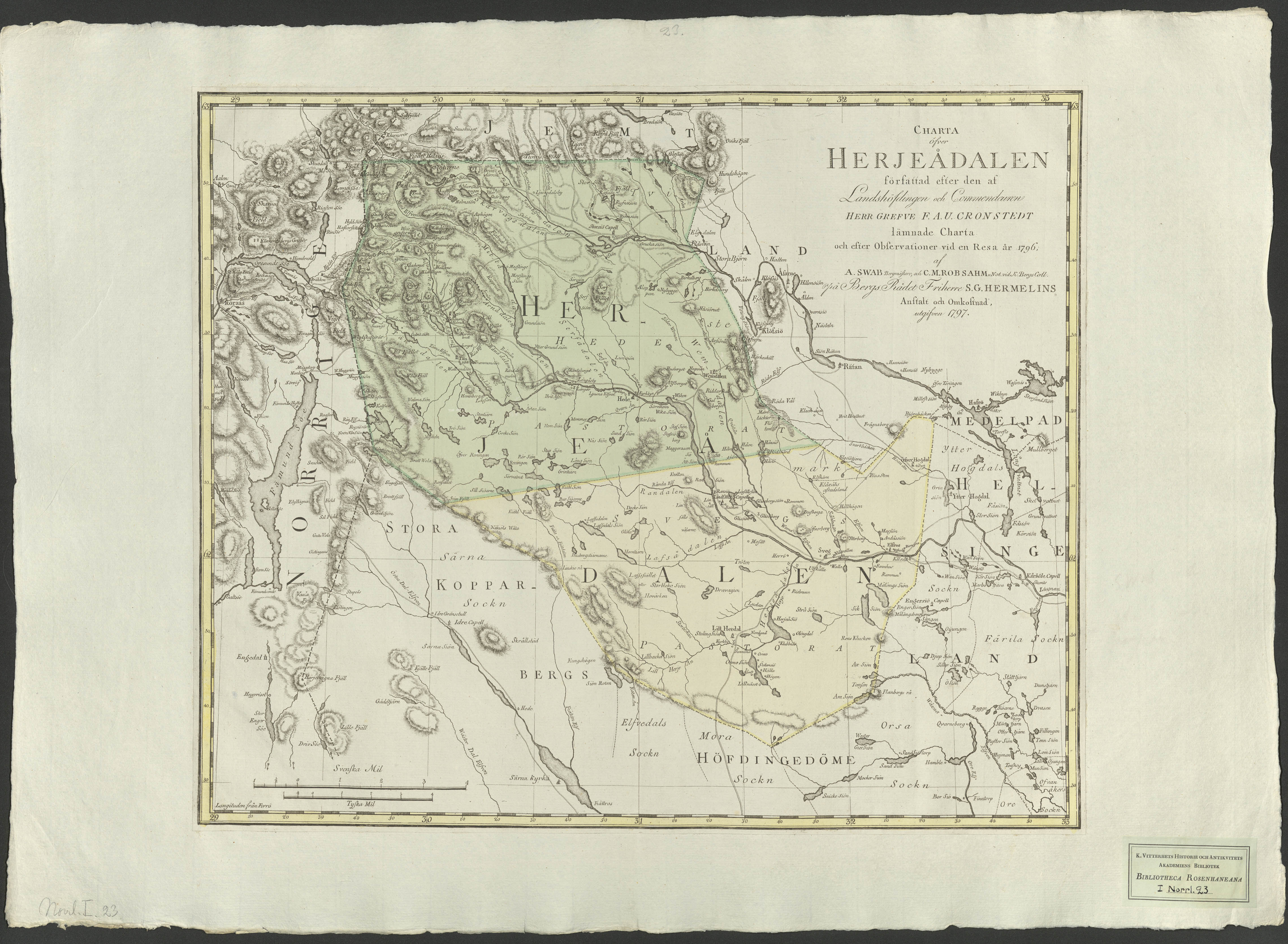 Beskrivning: 1 karta: Redovisar sockengränser, kyrkor, byar, vägar, vattendrag. Höjder med backstreck. Upprättad av A. Swab, C. M. Robsahm
