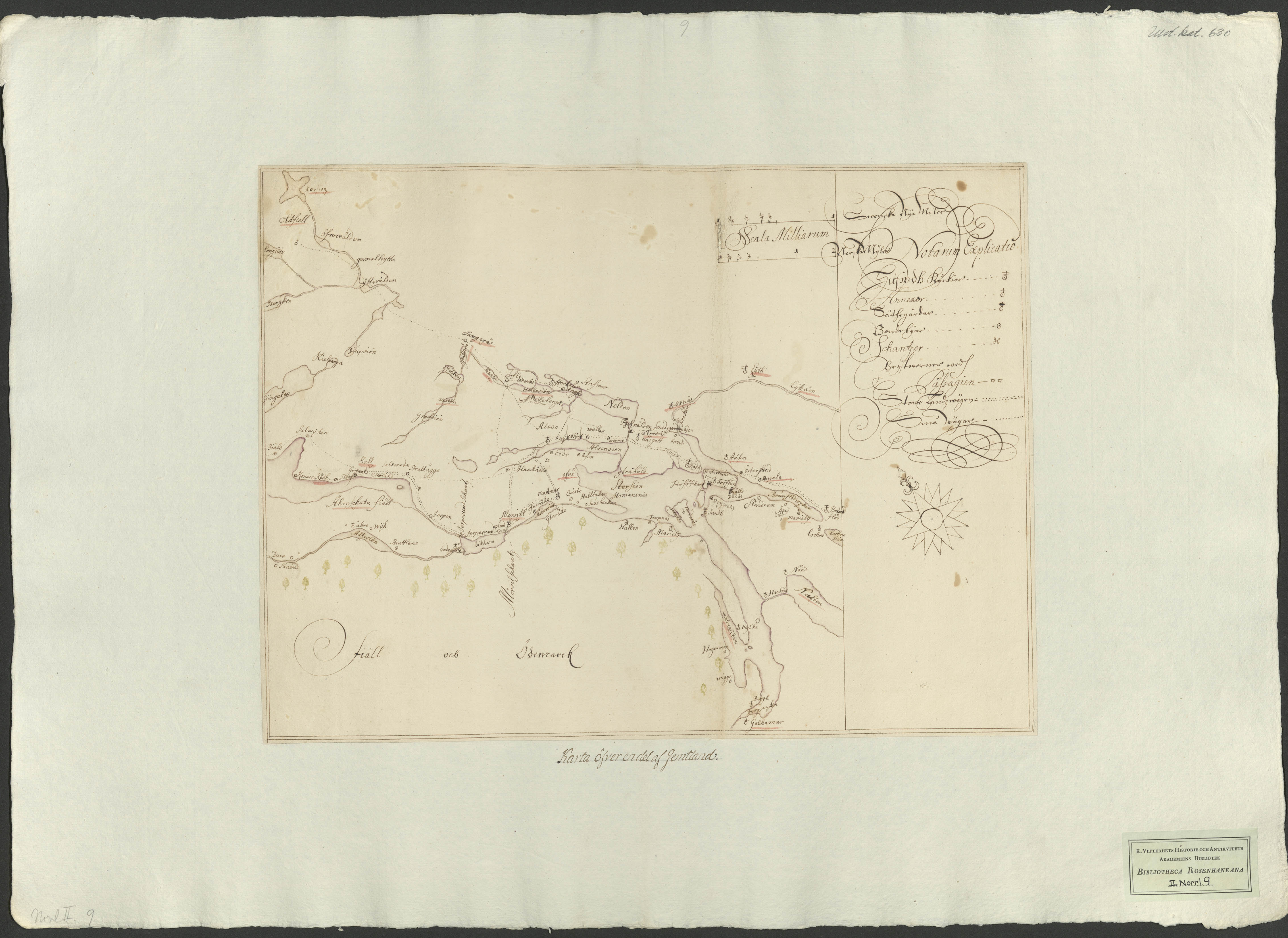 Beskrivning: 1 handritad karta : Legenden upptar: moderkyrkor, annexkyrkor, sätesgårdar, bondbyar, skansar samt större och mindre vägar.