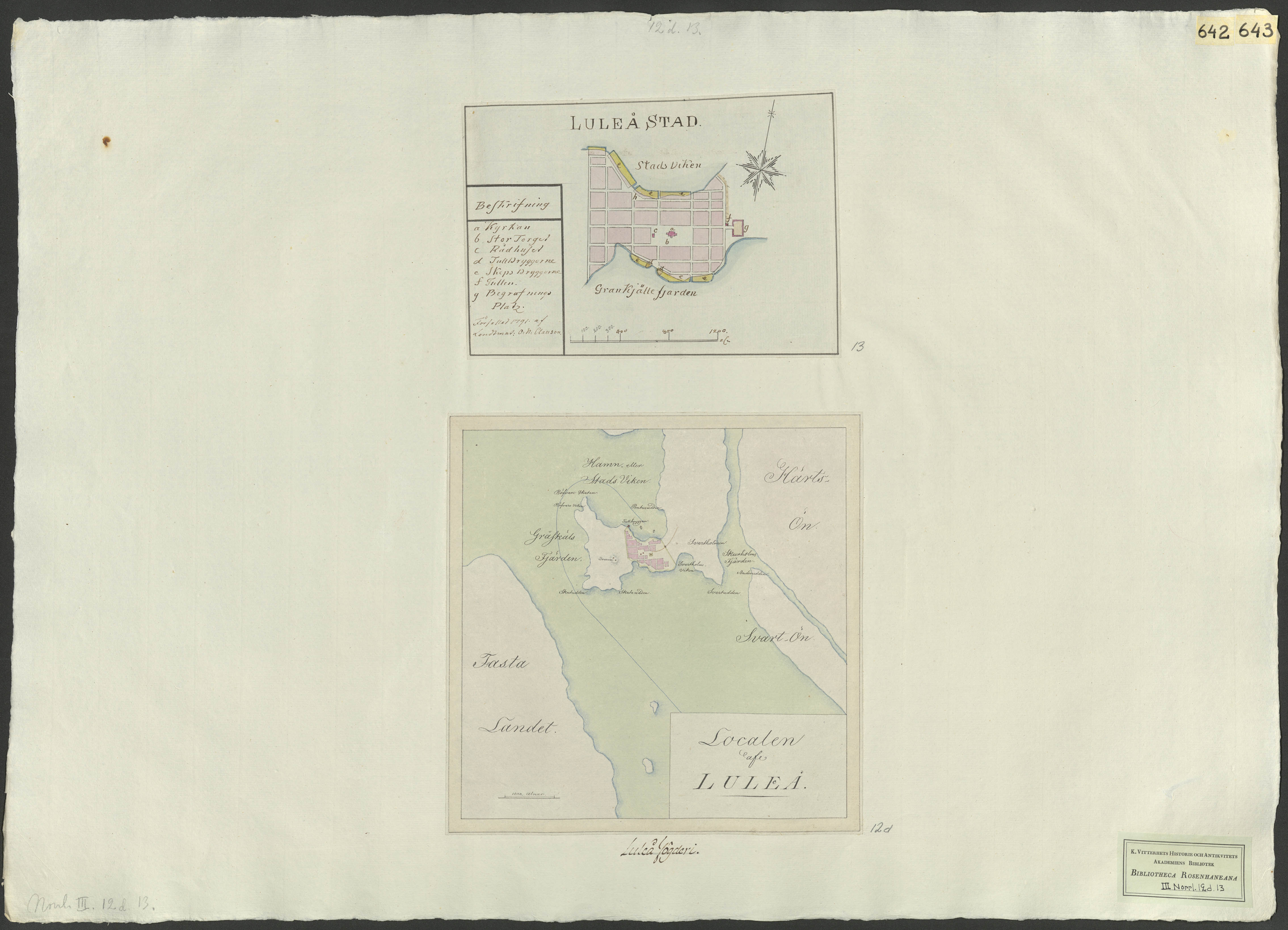 Beskrivning: 1 handritad karta : Visar stadskvarter och gator. Teckenförklaring. Nordpil. Skala ca 1:8 000.