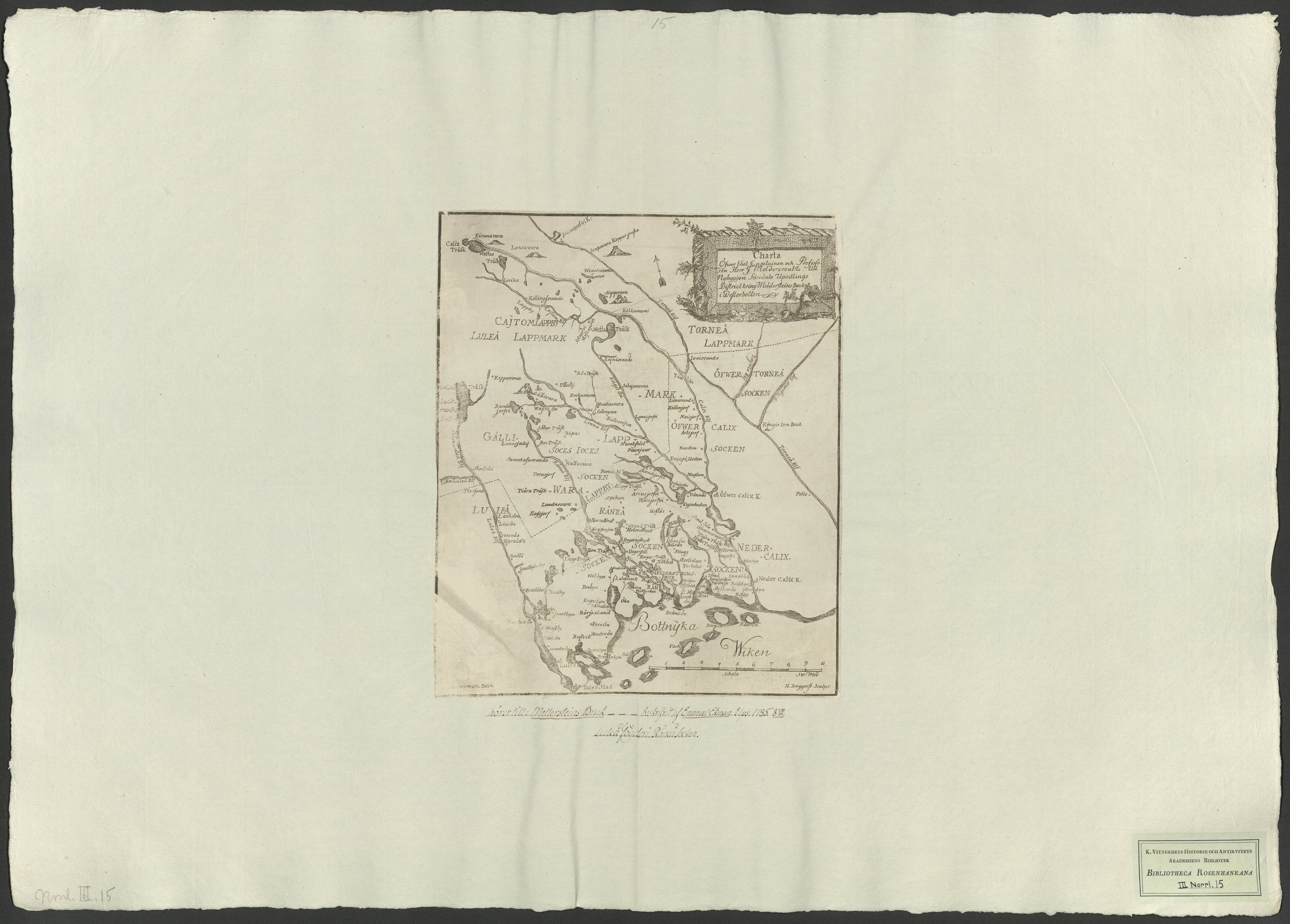 Charta öfwer thet Capitainen och Professoren Herr J. Meldercreutz till nybyggen förlänte uppodlings district kring Meldersteins bruk i Westerbotten.[Kartografiskt material]