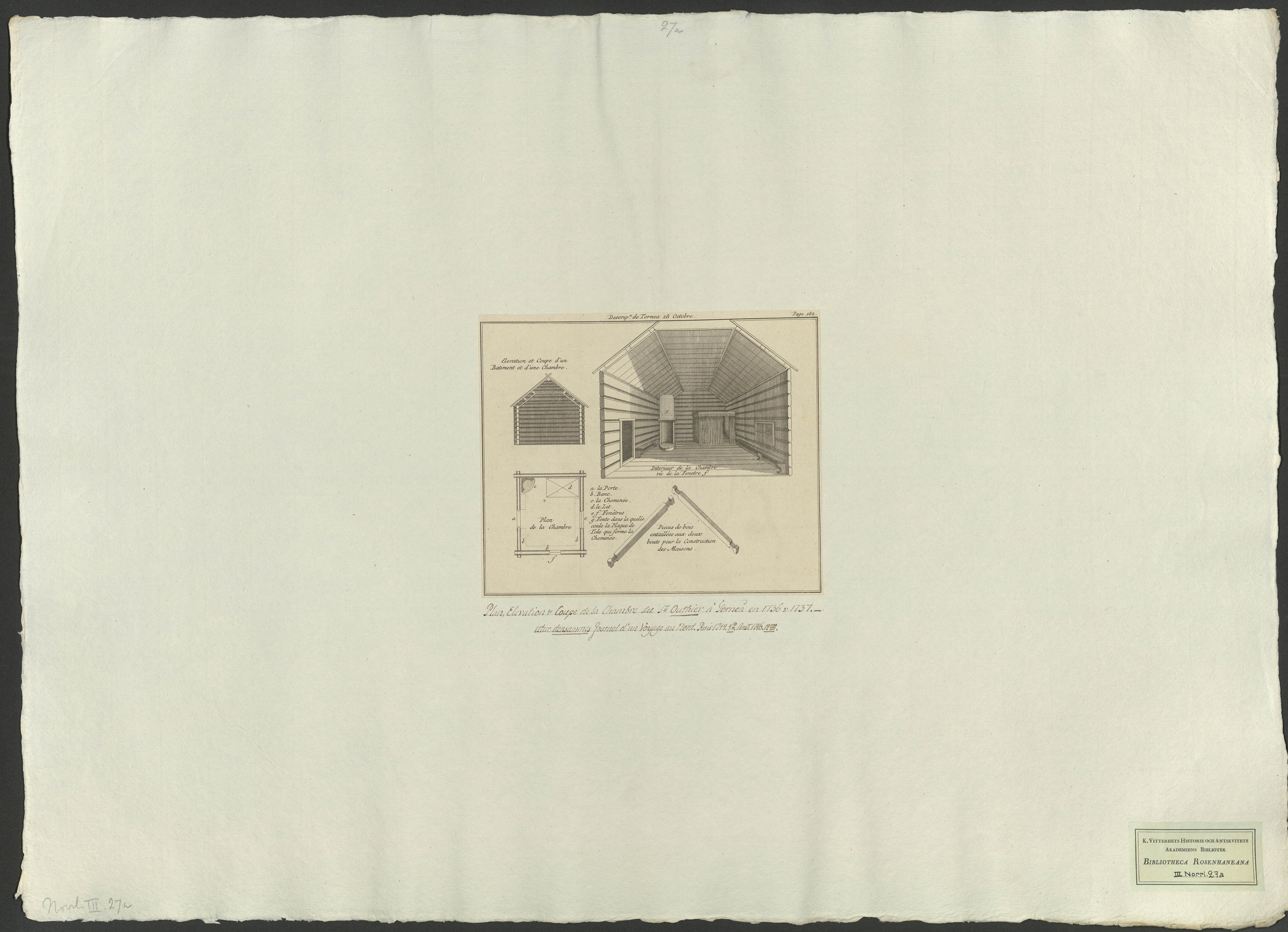 Beskrivning: 1 grafiskt bl. : Interiör, plan och detaljritningar av det timmerhus som Outhier bodde i under sin vistelse i Torneå. Med teckenförklaring.