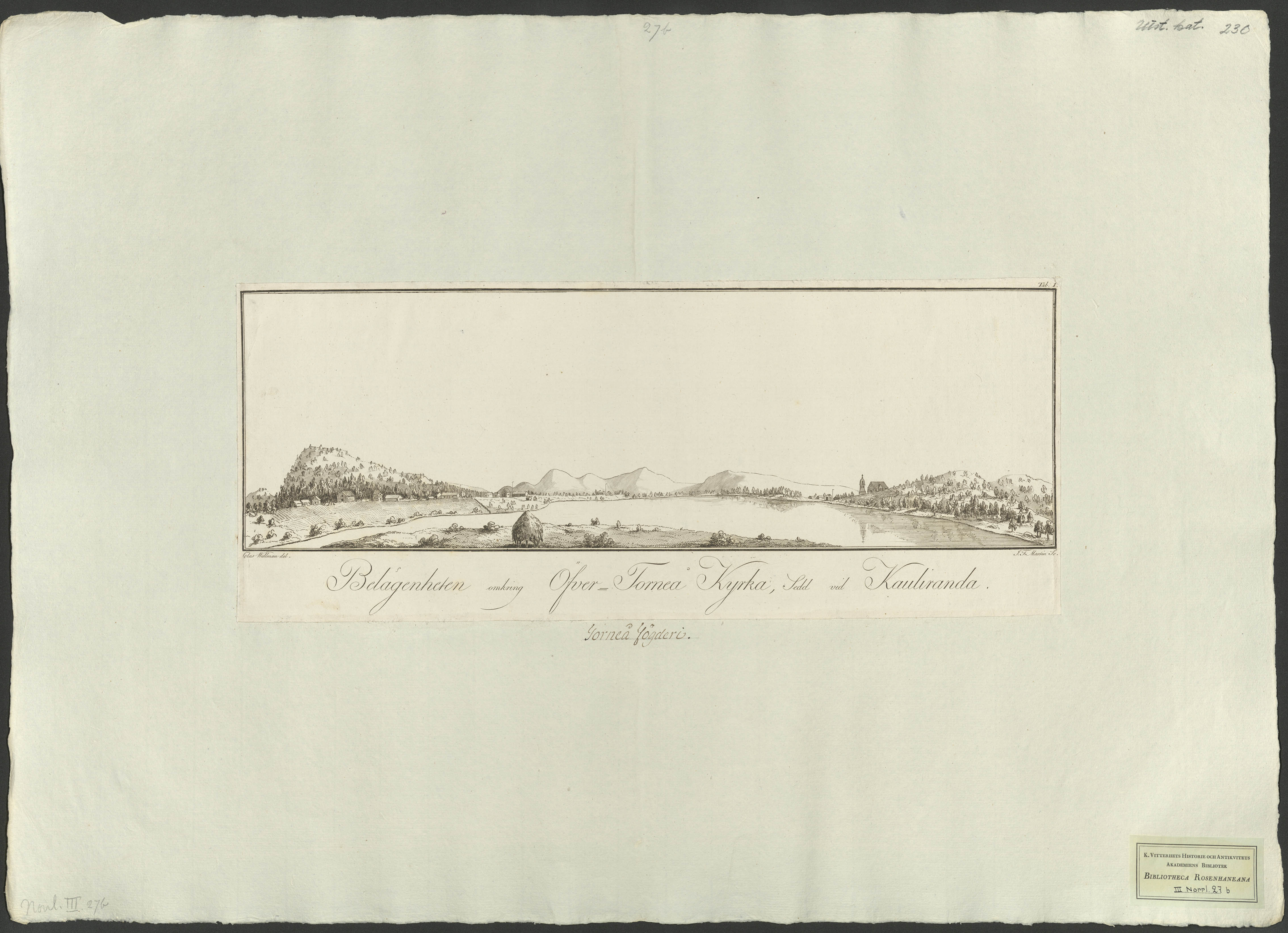Beskrivning: 1 grafiskt bl. : Landskapsvy med Över Torneå kyrka till höger i bild. Clas Wallman del. ; J. F. Martin Sc