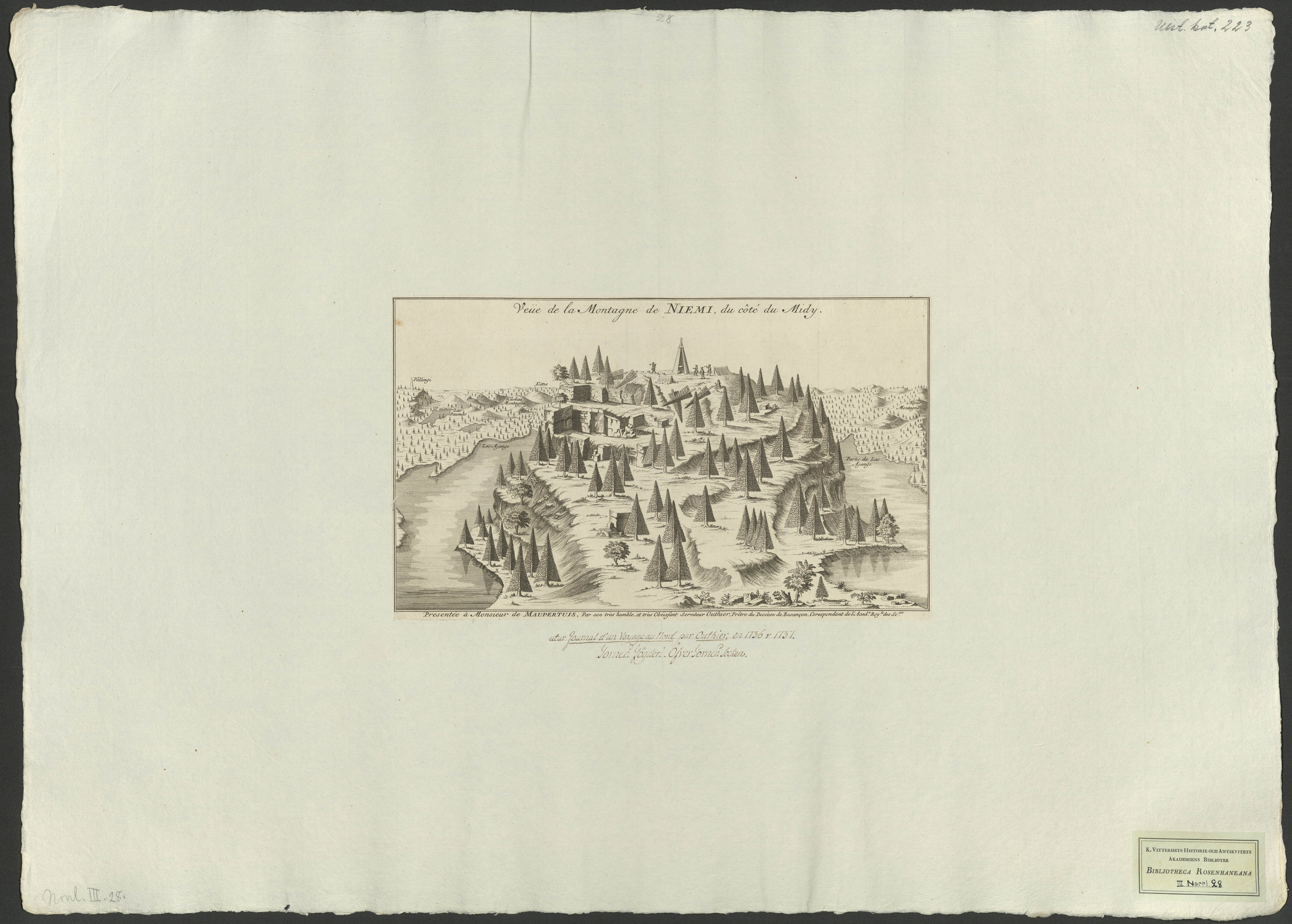 Beskrivning: 1 grafiskt bl. : Fantasifullt avbildat skogslandskap med granar och kåtor.