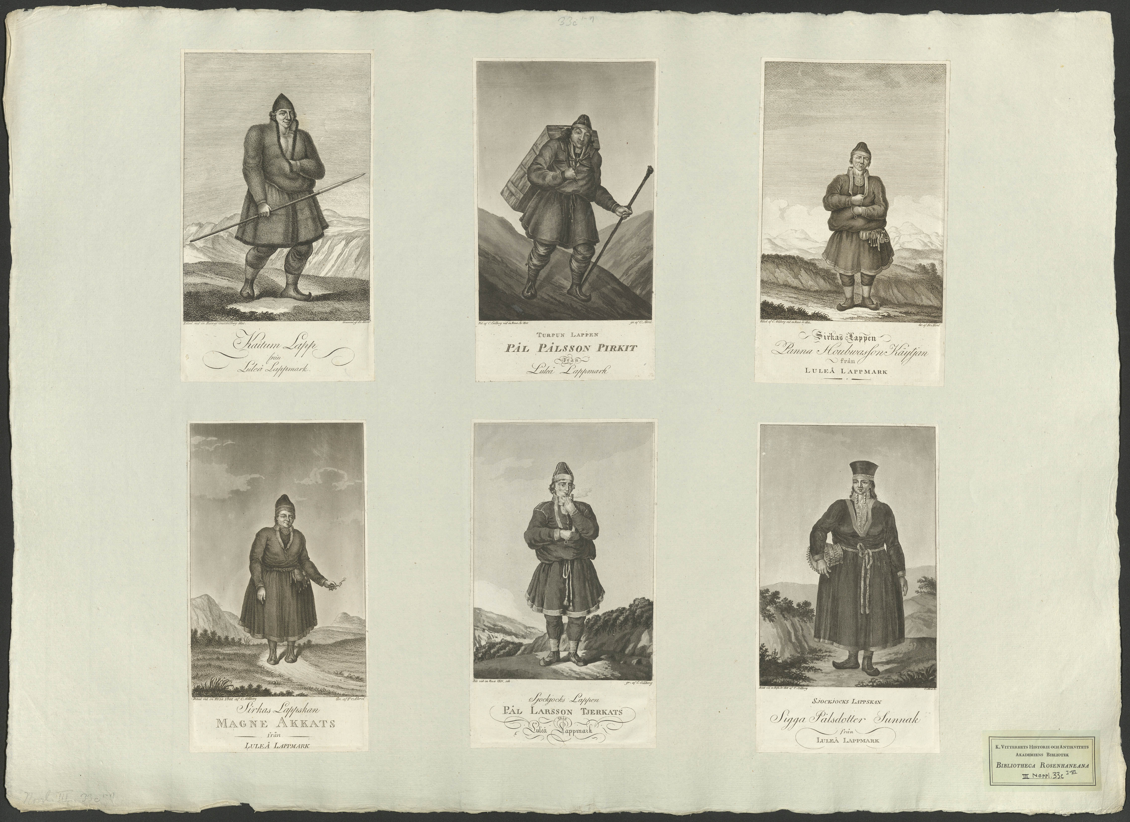 Beskrivning: 6 grafiska bl. : Alla sex bladen ritade av Gillberg. Tre graverade av Fredrik Akrel. Två av Carl Akrel och ett av Gustav Gillberg. ritad vid en resa af Gust. Gillberg 1801 ; Graverad af Fr. Akrel ; Gr af C. Akrel