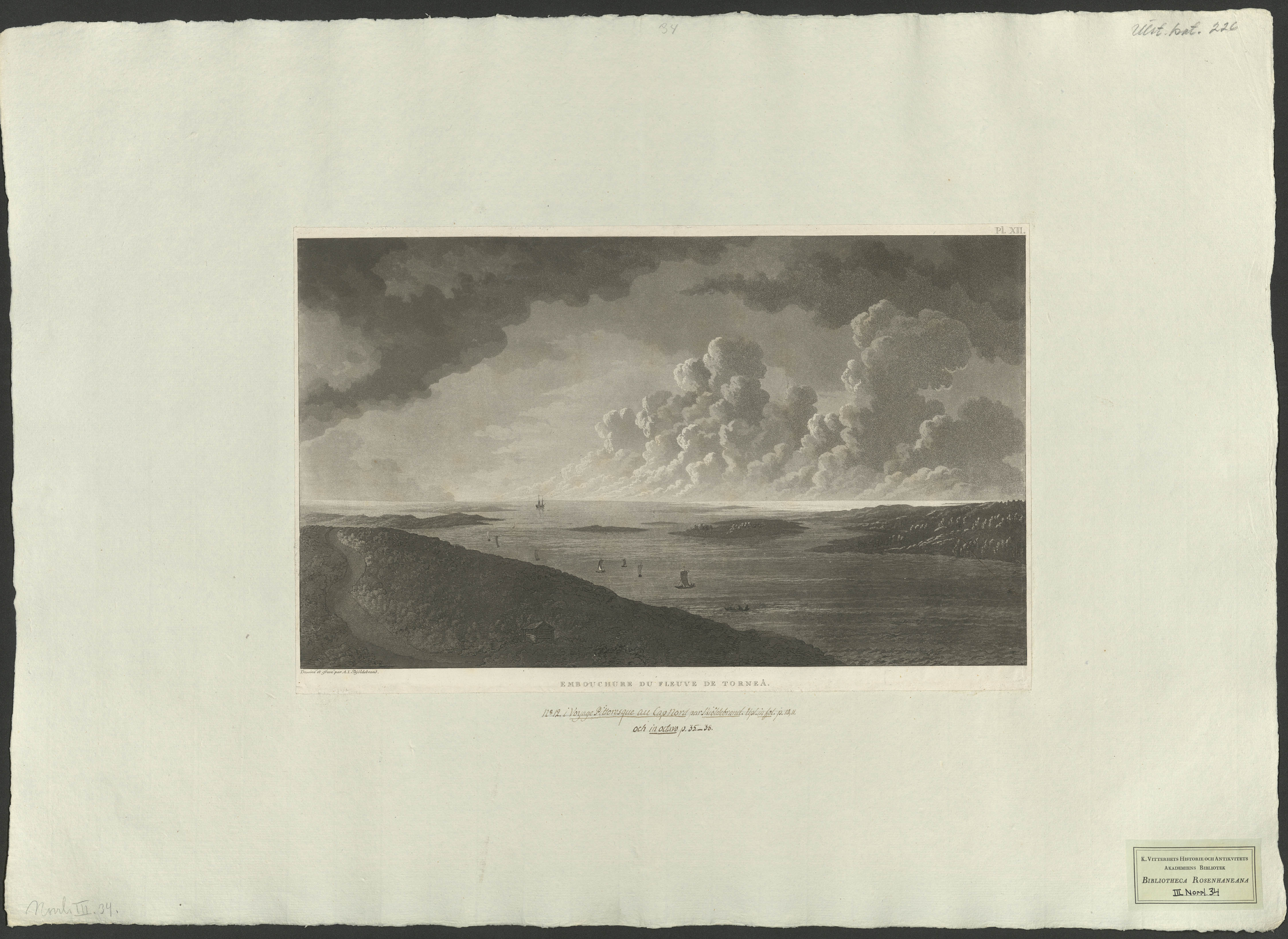 Beskrivning: 1 grafiskt bl. : Panorama över Torne älv. Dessiné et gravé par A. F. Skjöldebrand