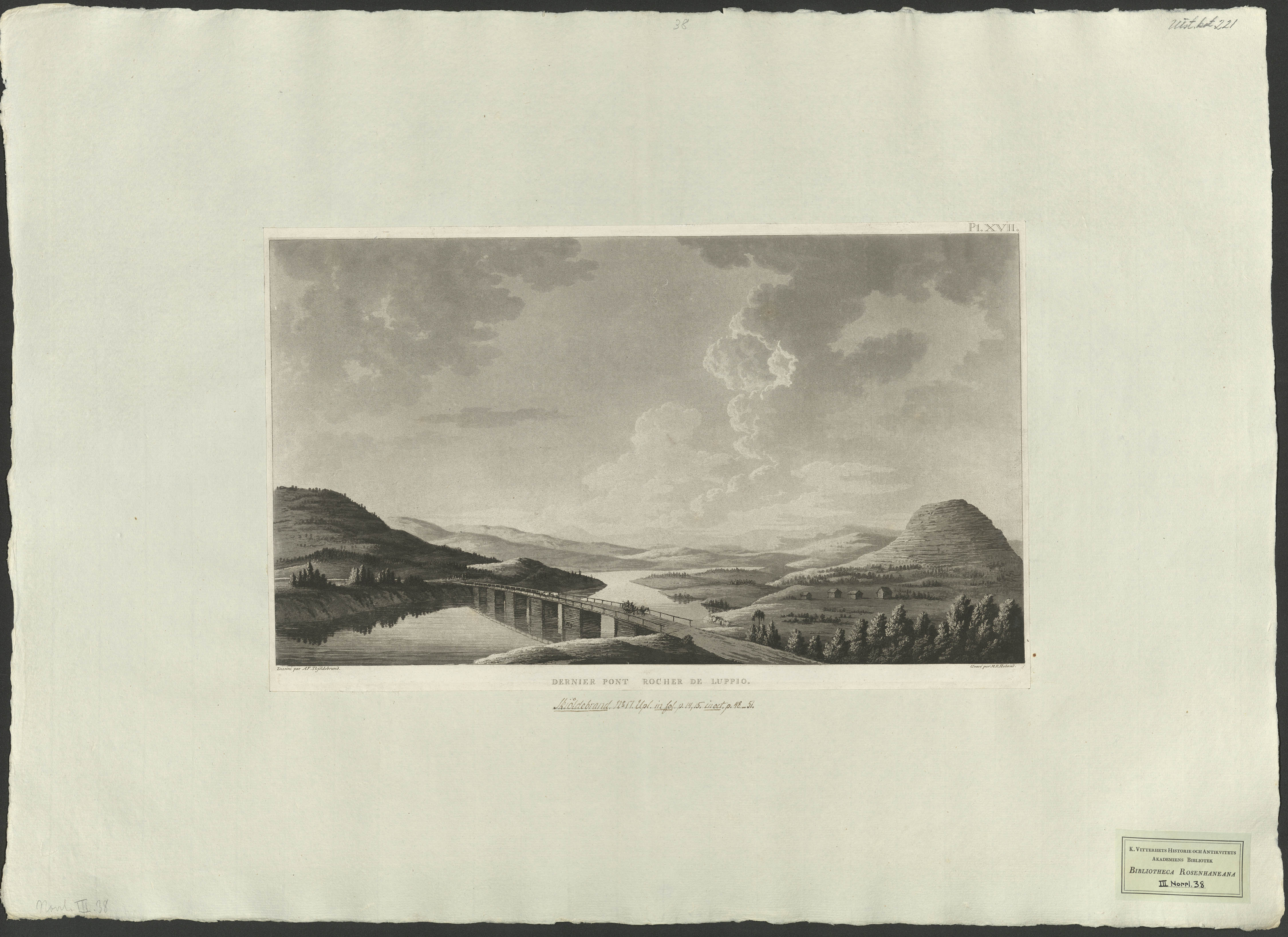 Beskrivning: 1 grafiskt bl. : Panorama över Torneälven och bron vid Luppio. Dessiné par A. F. Skjöldebrand ; Gravé par M. Heland