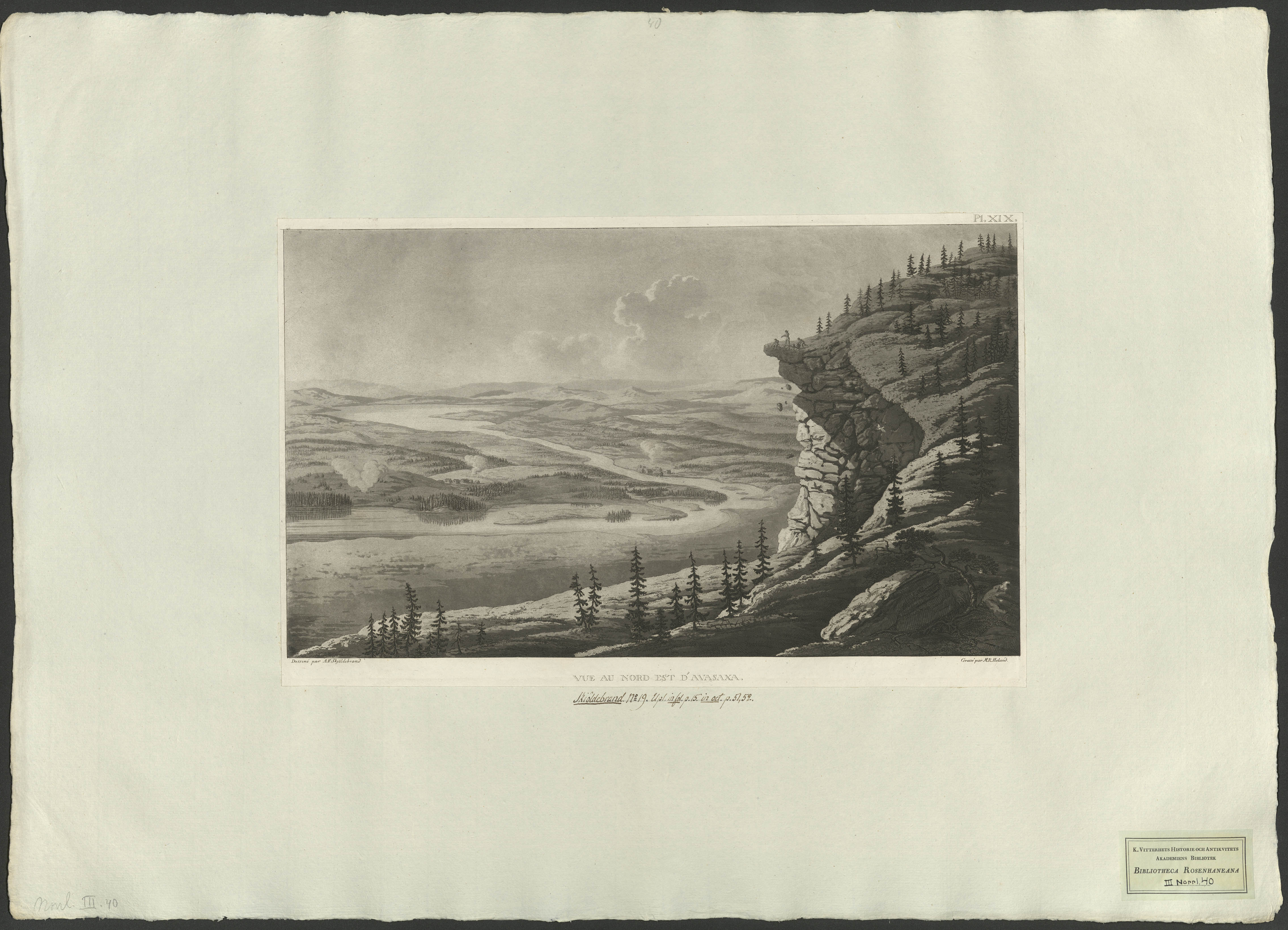 Beskrivning: 1 grafiskt bl. : Utsikt från berget Avasaxa i Dorotea, Lappland. På ett klipputsprång står några män och kastar ner stenar över stupet. Dessiné par A. F. Skjöldebrand ; Gravé par M. Heland