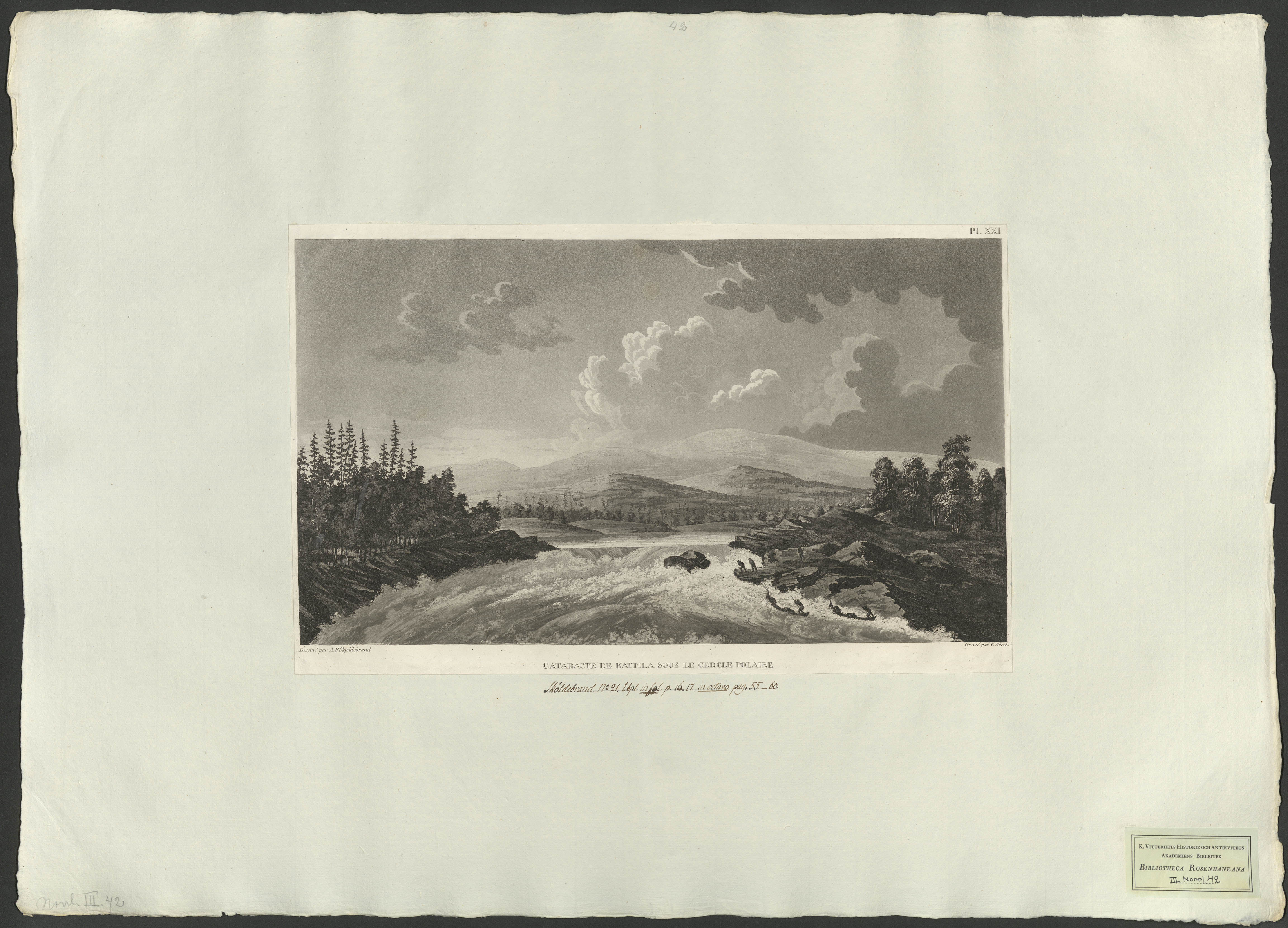 Beskrivning: 1 grafiskt bl. : Panorama över Kattilaforsen. Dessiné par A. F. Skjöldebrand ; Gravé par C. Akrel.