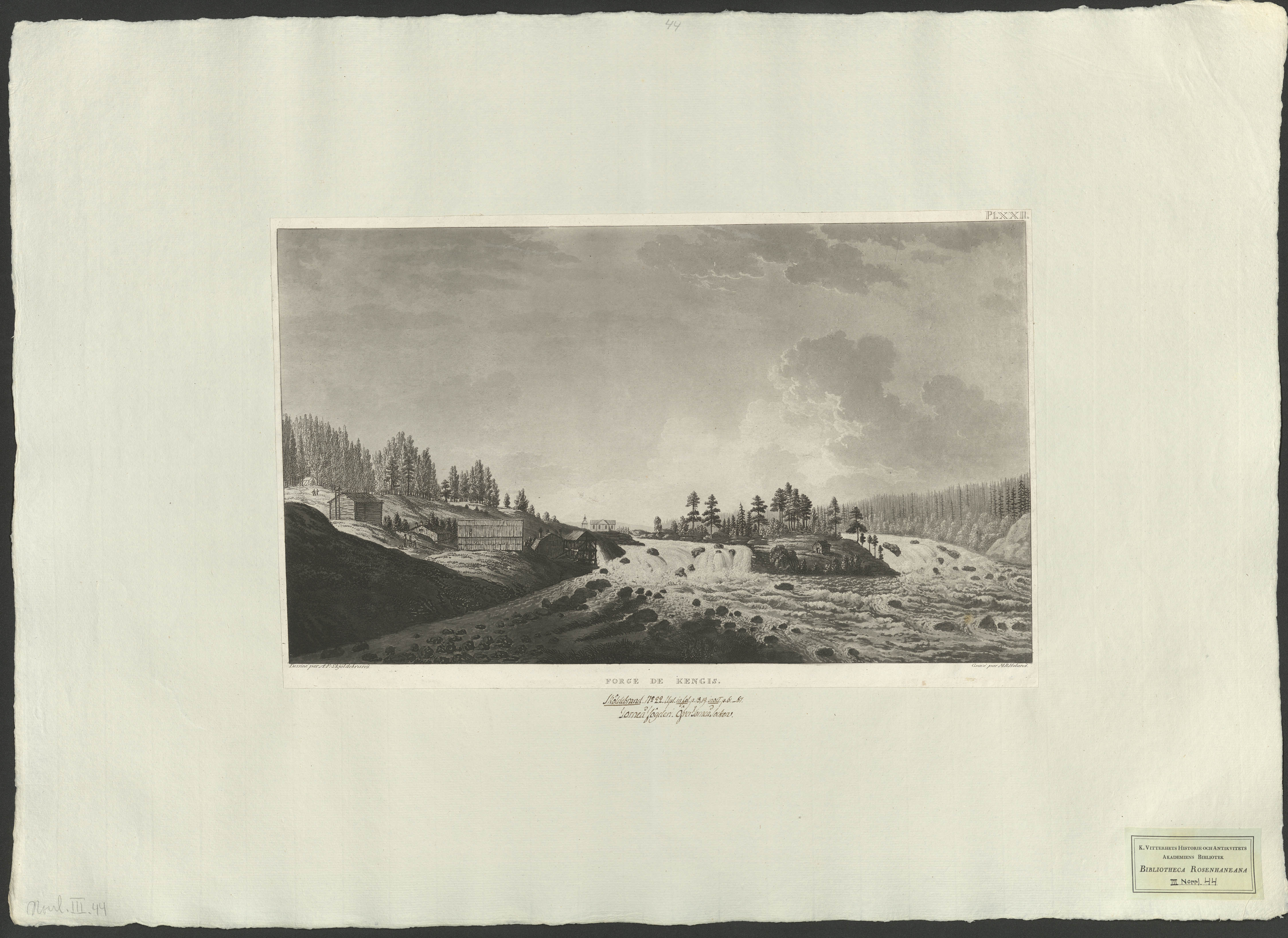 Beskrivning: 1 grafiskt bl. : Panorama över Kengisforsen med en smedja vid stranden. I bakgrunden kyrka och klockstapel. Dessiné par A. F. Skjöldebrand ; Gravé par M. R. Heland.