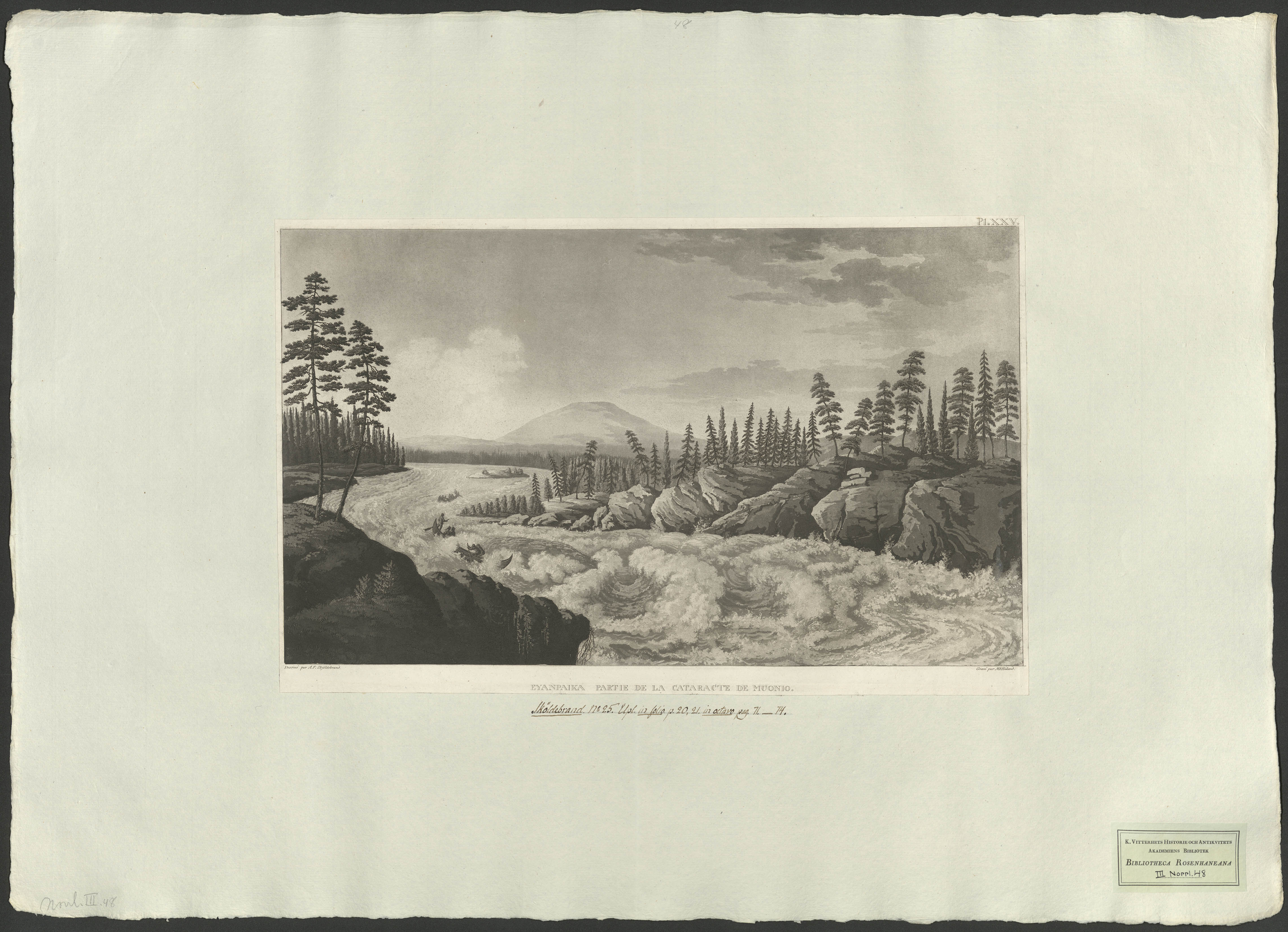 Beskrivning: 1 grafiskt bl. : Panorama över forsarna vid Eyanpaika Muonio älv. Dessiné par A. F. Skjöldebrand ; Gravé par M. R. Heland.