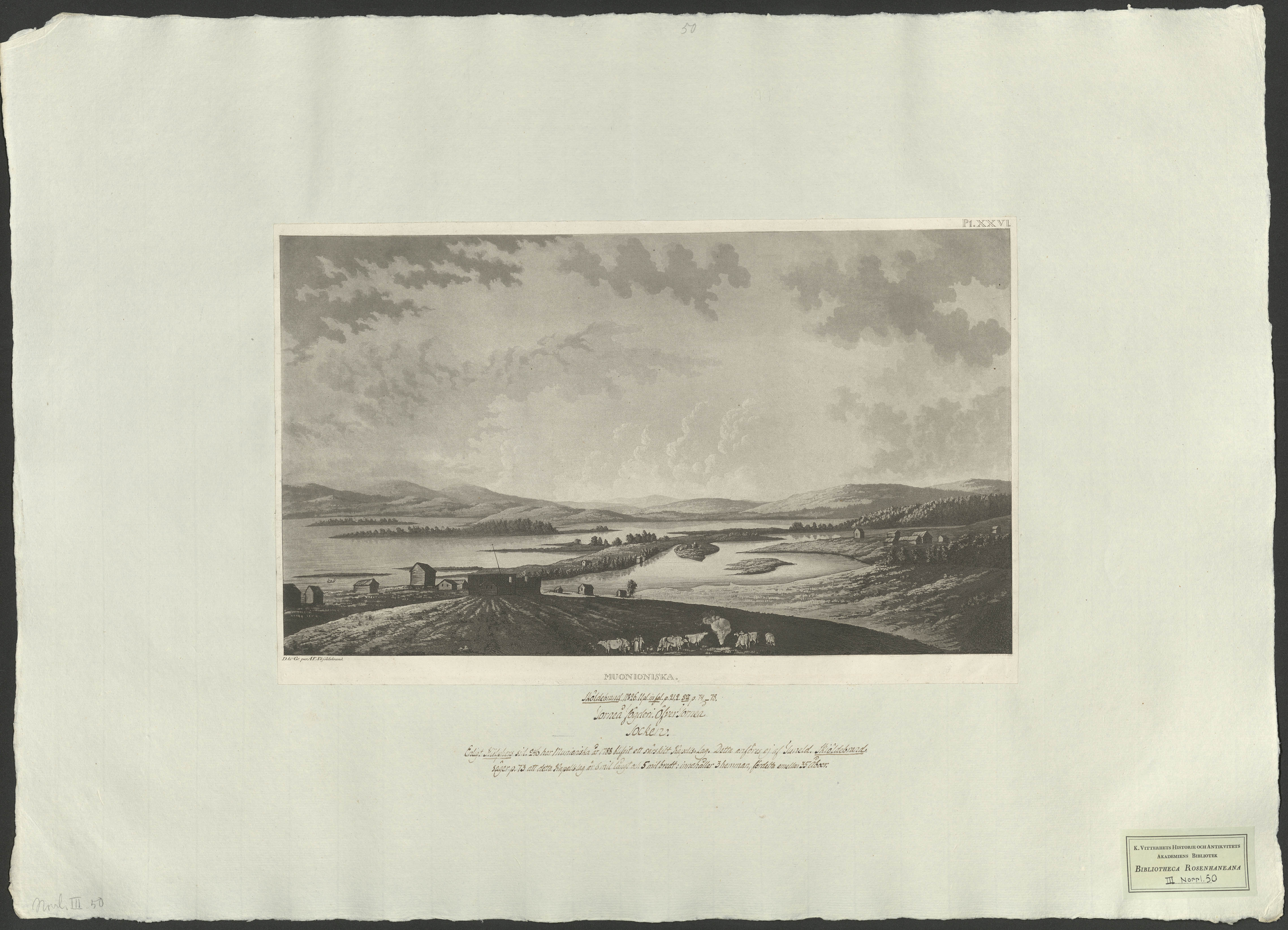Beskrivning: 1 grafiskt bl. : Panorama över Muonioniska vid Muonio älv. Ängslador och betande kreatur. D. et gr. par A. F. Skjöldebrand