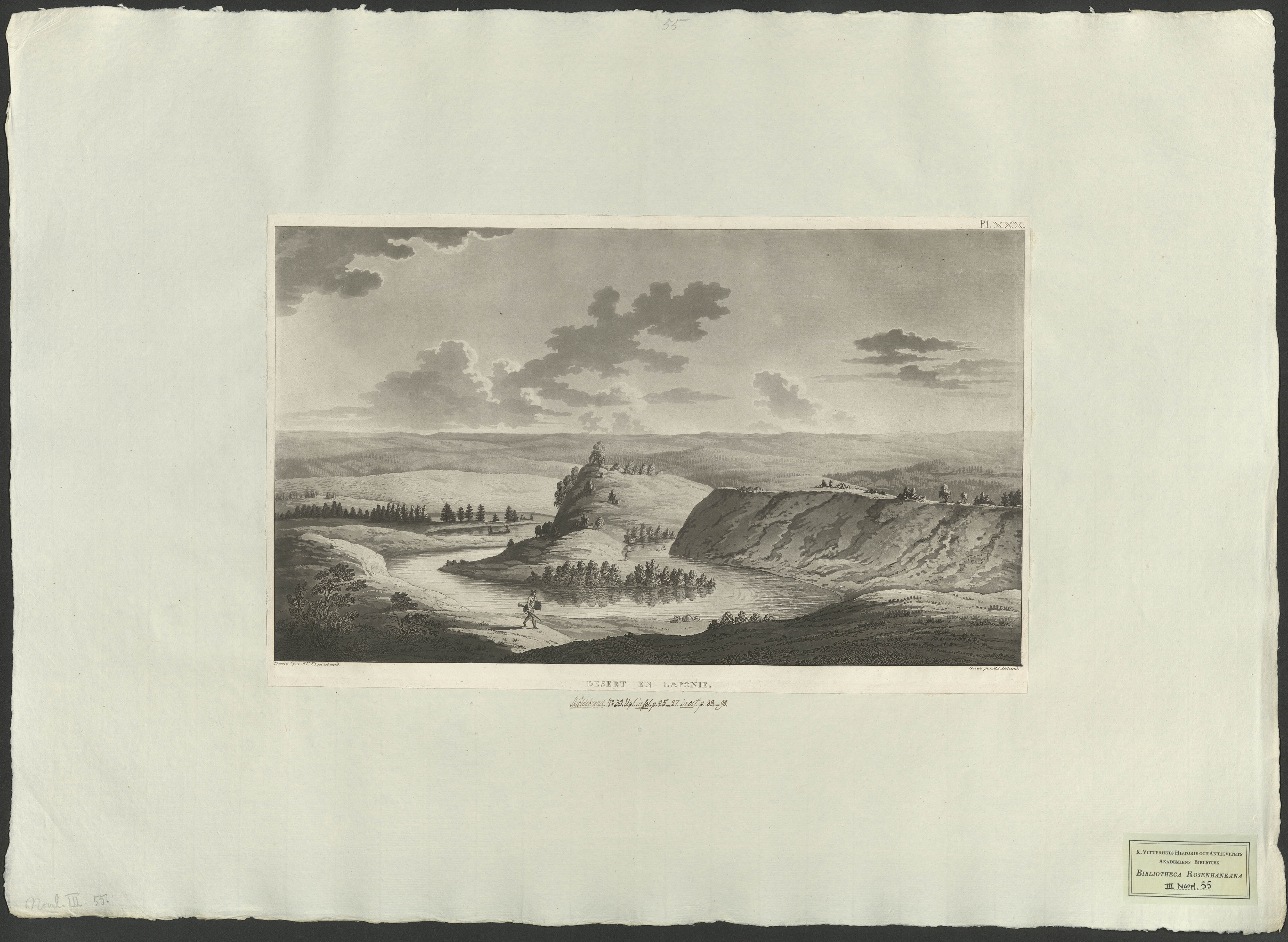 Beskrivning: 1 grafiskt bl. : Panorama över en ödemark med en flodkrök. En ensam man med ritblock och gevär vandrar längs stranden. Dessiné par A. F. Skjöldebrand ; Gravé par M. R. Heland.