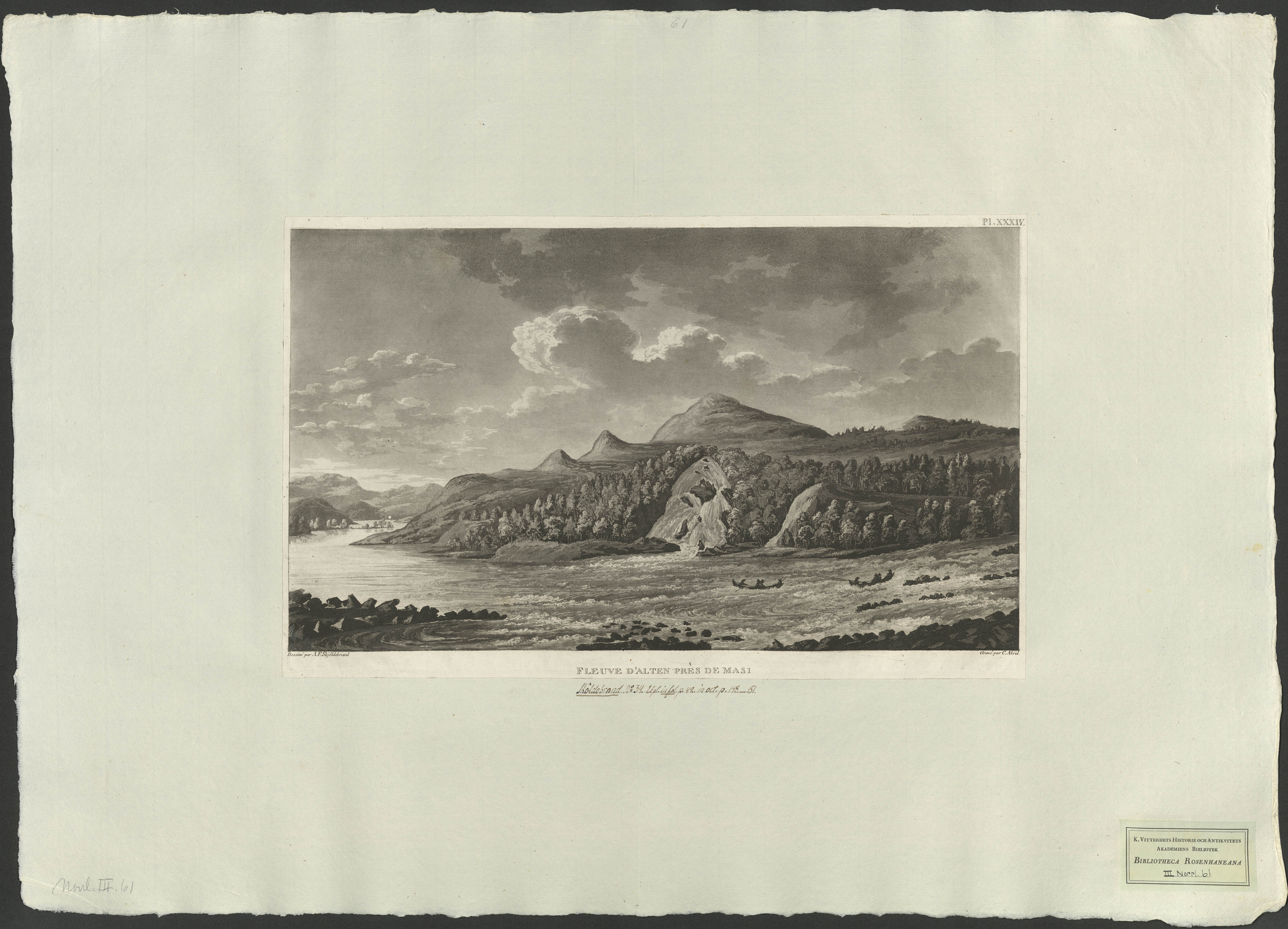 Beskrivning: 1 grafiskt bl. : Vy över Altaälven. Dessiné par A. F. Skjöldebrand. Gravé par C. Akrel