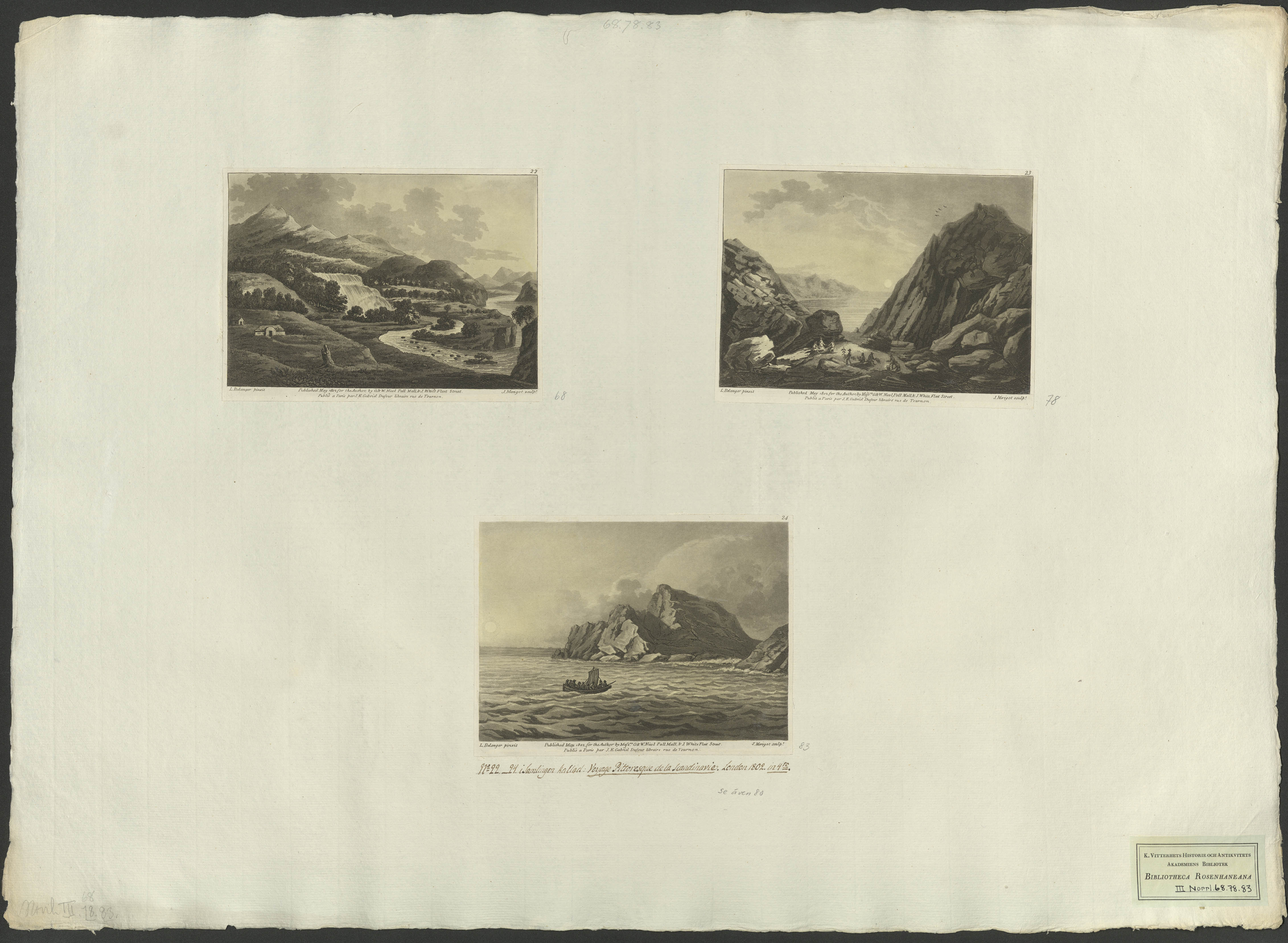Beskrivning: 1 grafiskt bl. : Vy över ett brett vattenfall som strömmar ner i en älv. Några hus på älvbrinken. L. Belanger pinxit ; J. Merigot sculp