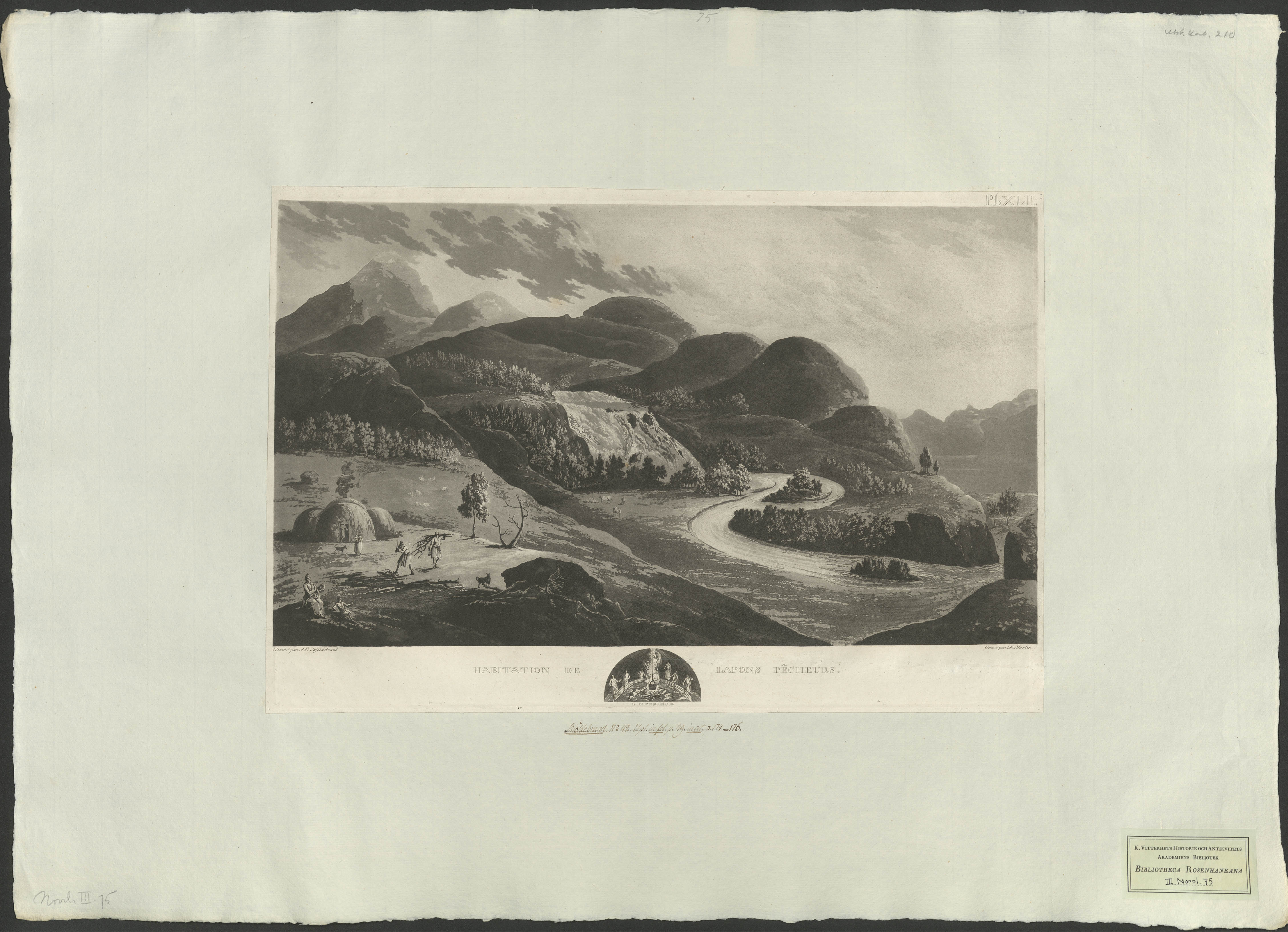 Beskrivning: 1 grafiskt bl. : Vy över en samebosättning. I bakgrunden ett brett vattenfall. Dessiné par A. F. Skjöldebrand. Gravé par I. F. Martin