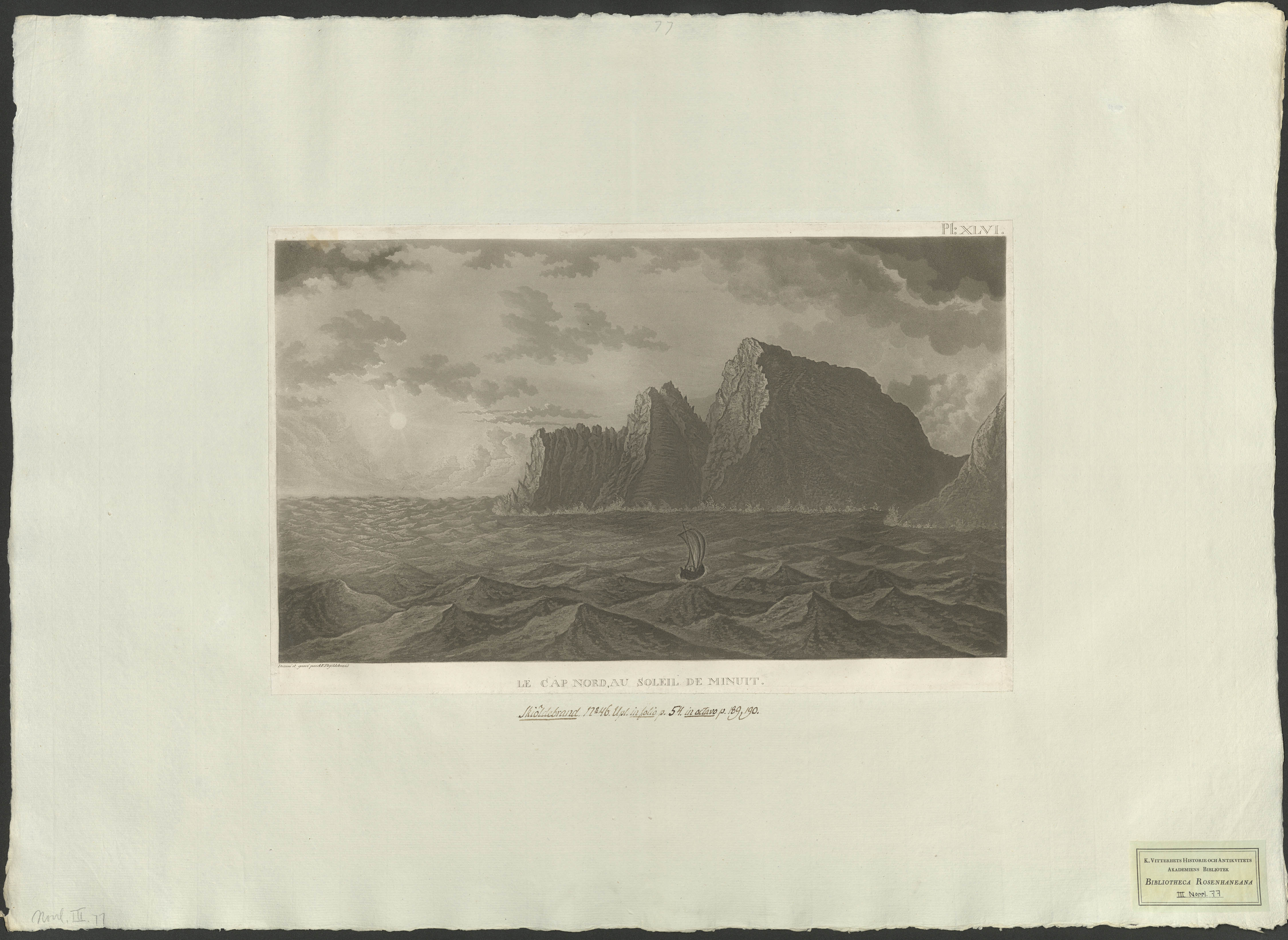 Beskrivning: 1 grafiskt bl. : Vy över klipporna vid Nordkap. dessiné et gravé par A. F. Skjöldebrand
