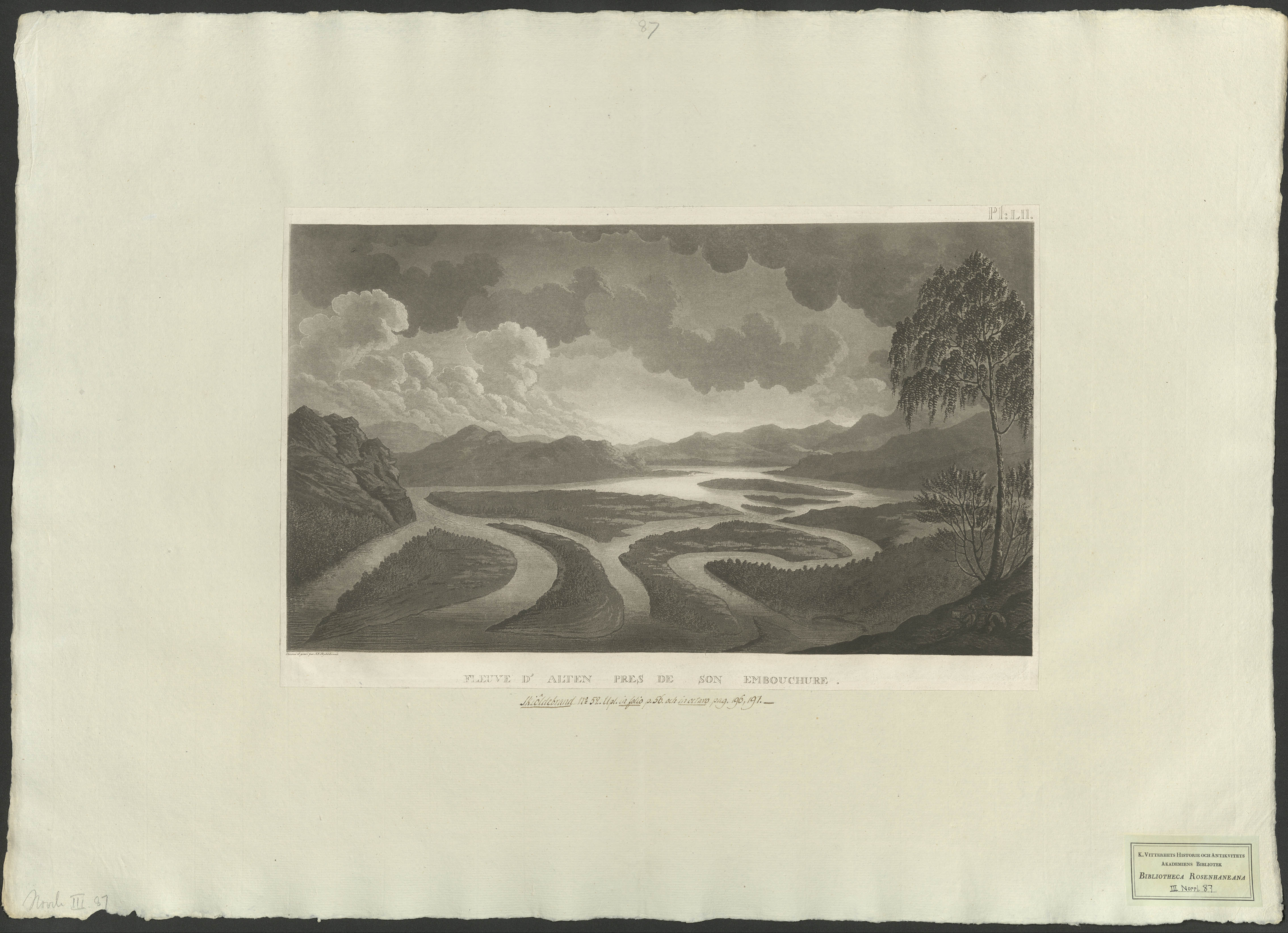 Beskrivning: 1 grafiskt bl. : Panorama över Altafjordens deltaland. Dessiné et gravé par A. F. Skjöldebrand