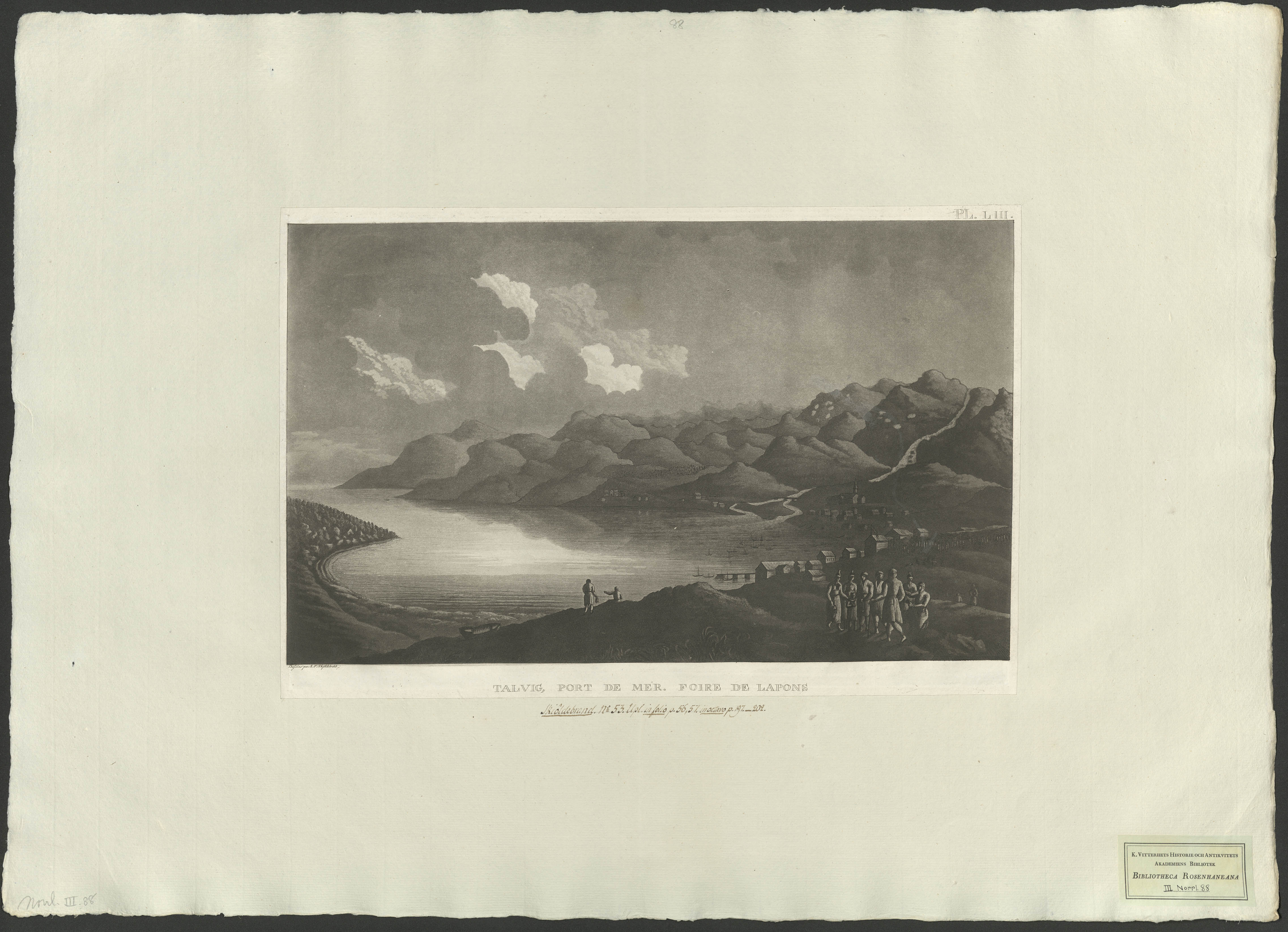Beskrivning: 1 grafiskt bl. : Panorama över naturhamnen och samhället Talvig. Dessiné par A. F. Skjöldebrand