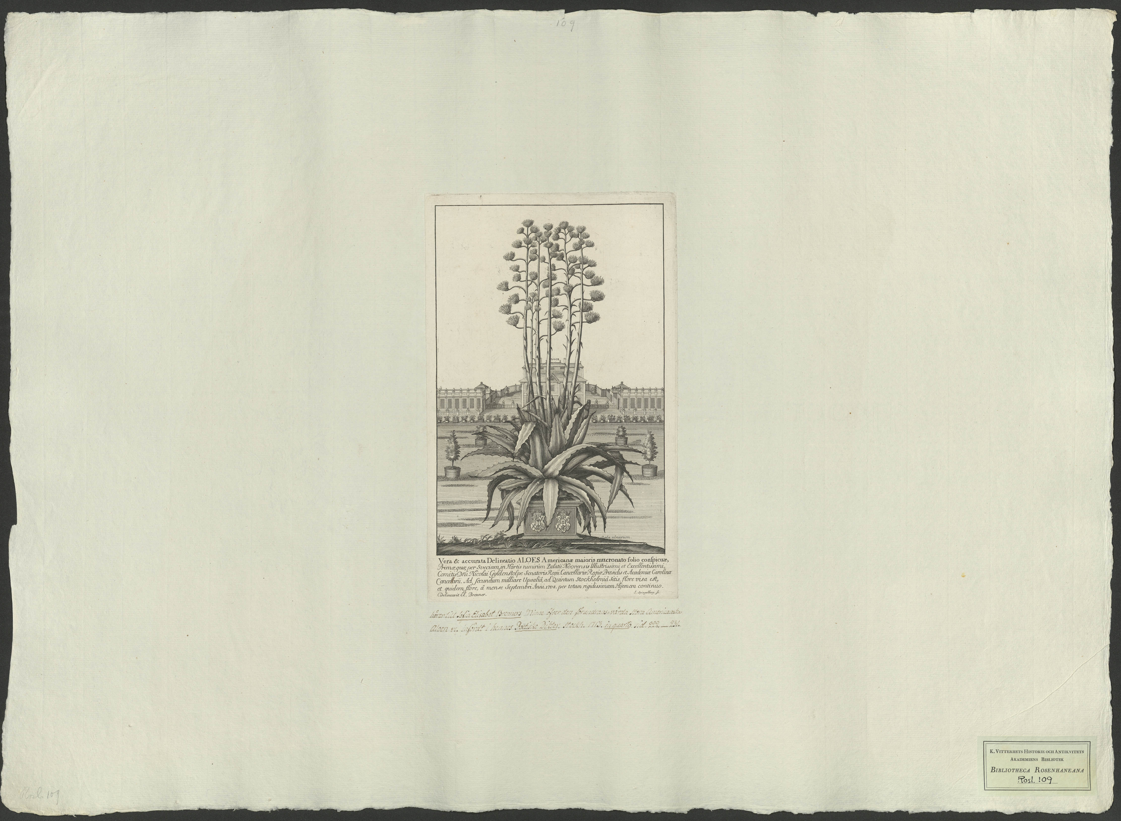 Beskrivning: 1 grafiskt bl. : Teckning av stor Aloe i kruka. I bakgrunden en slottsliknande byggnad. Skalstock i alnar. Delineavit El. Brenner. J. Spiegelberg Sculp.