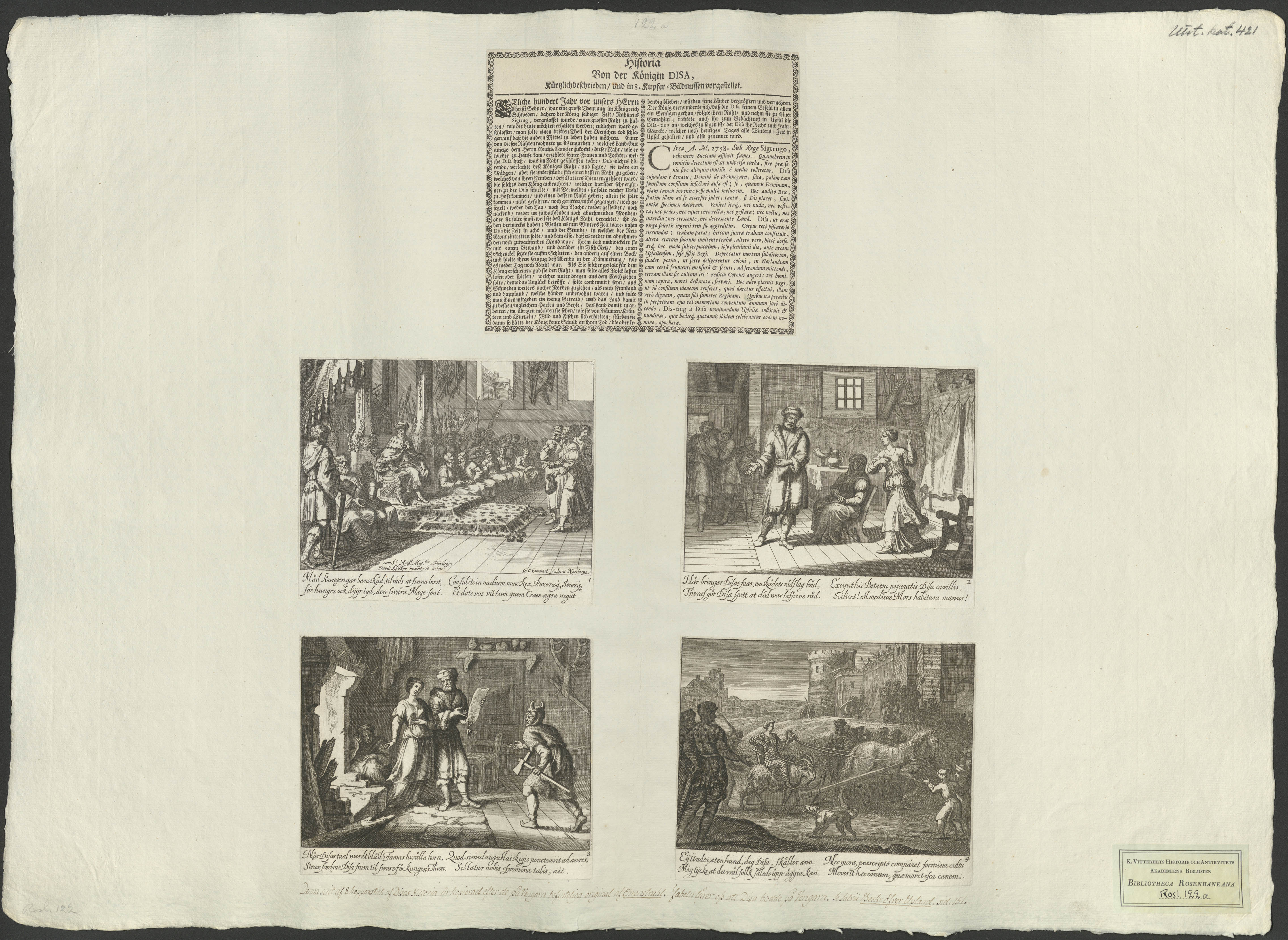 Beskrivning: 5 grafiska bl. : En textsida samt fyra bilder ur Disa-sviten klistrade tillsammans. Se även de fyra följande på Rh Rosl 122b samt en liknande serie om fyra kopparstick på Rh Rosl 122c. David Klöcker invent: et delin. ; G. C. Eimmart sculpcit Noribergæ.