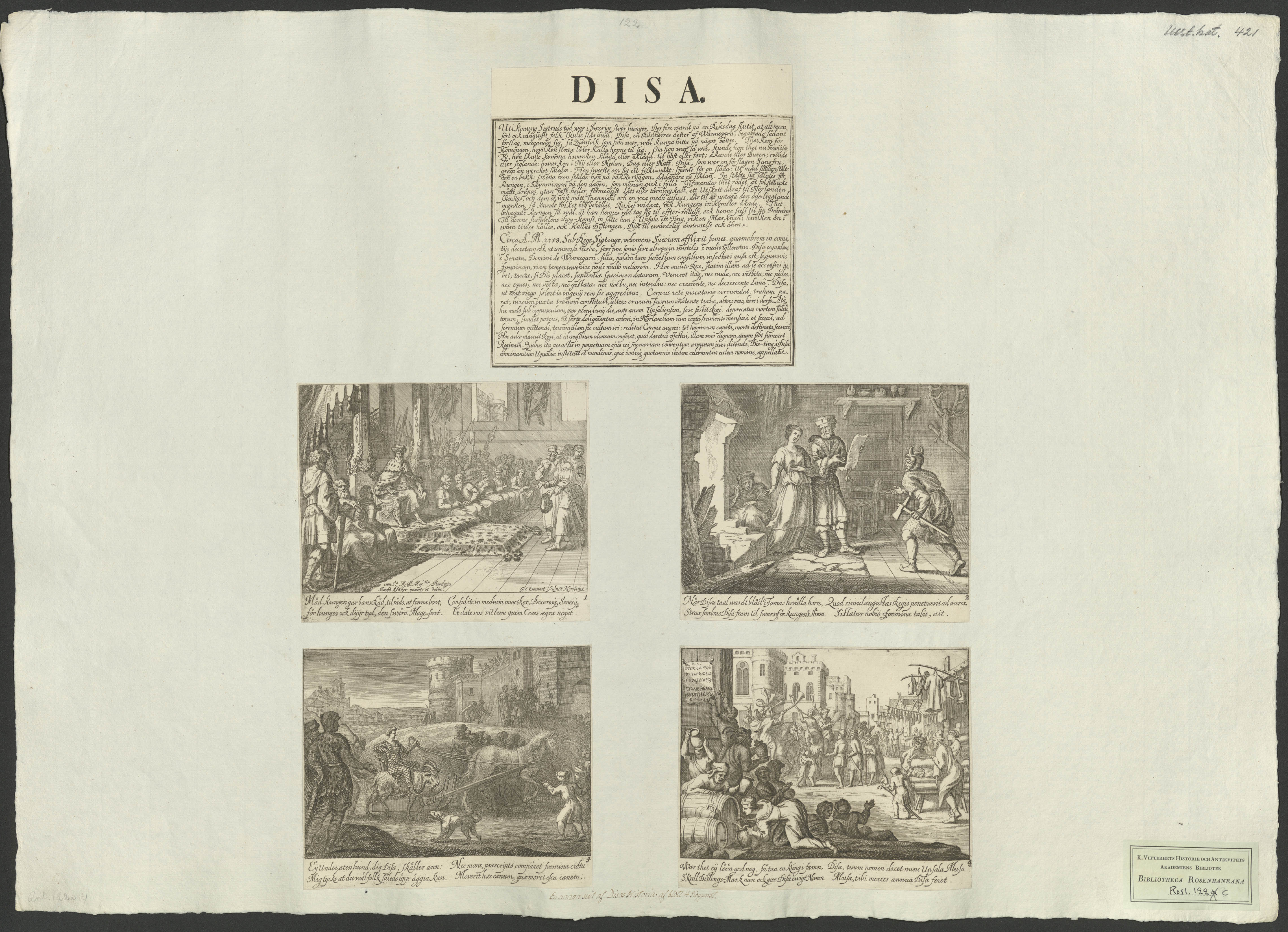 Beskrivning: 5 grafiska bl. : En textsida samt fyra bilder ur Disa-sviten klistrade tillsammans. Se även liknande på Rh Rosl 122a samt Rh Rosl 122b.