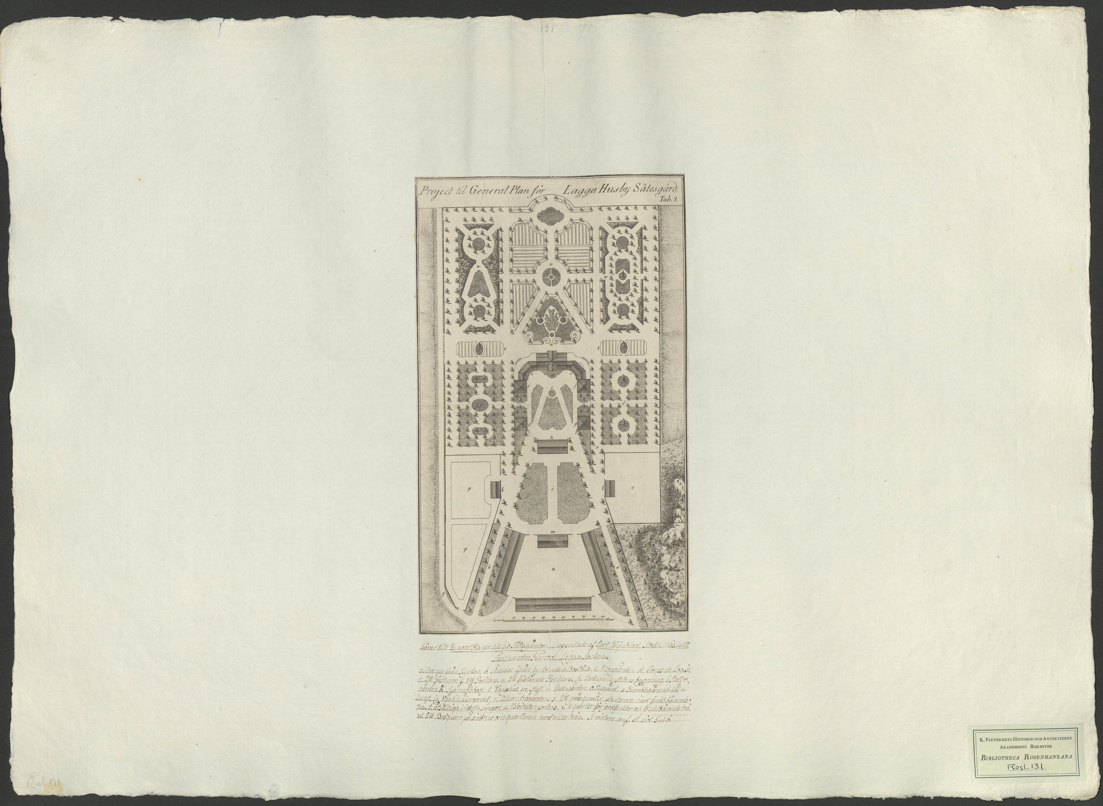 Beskrivning: 1 grafiskt bl. : Plan över byggnader och trädgård. Skala 1 cm = ca 15 alnar.