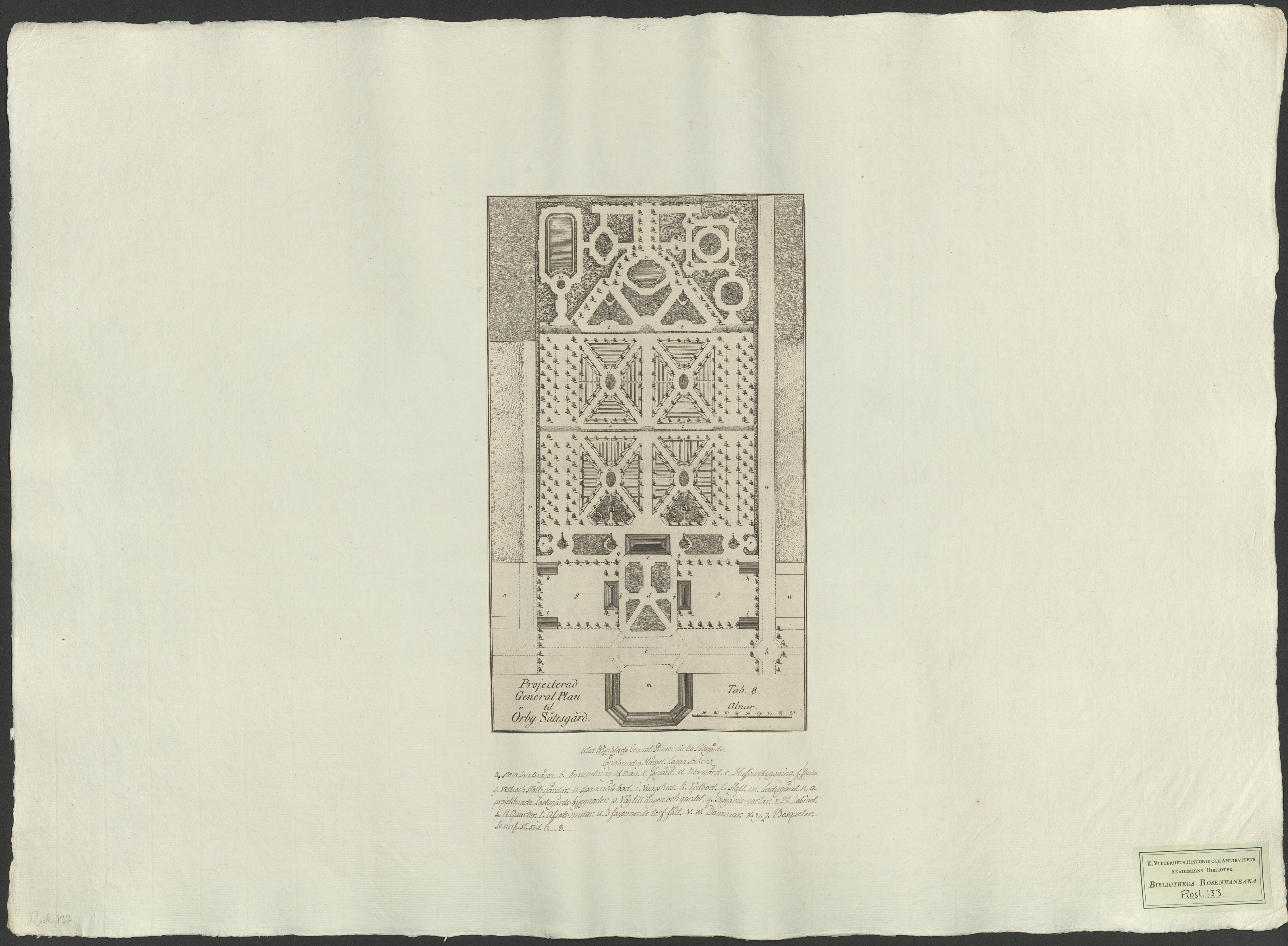 Beskrivning: 1 grafiskt bl. : Plan över byggnader och trädgård. Skala 1 cm = ca 14 alnar.