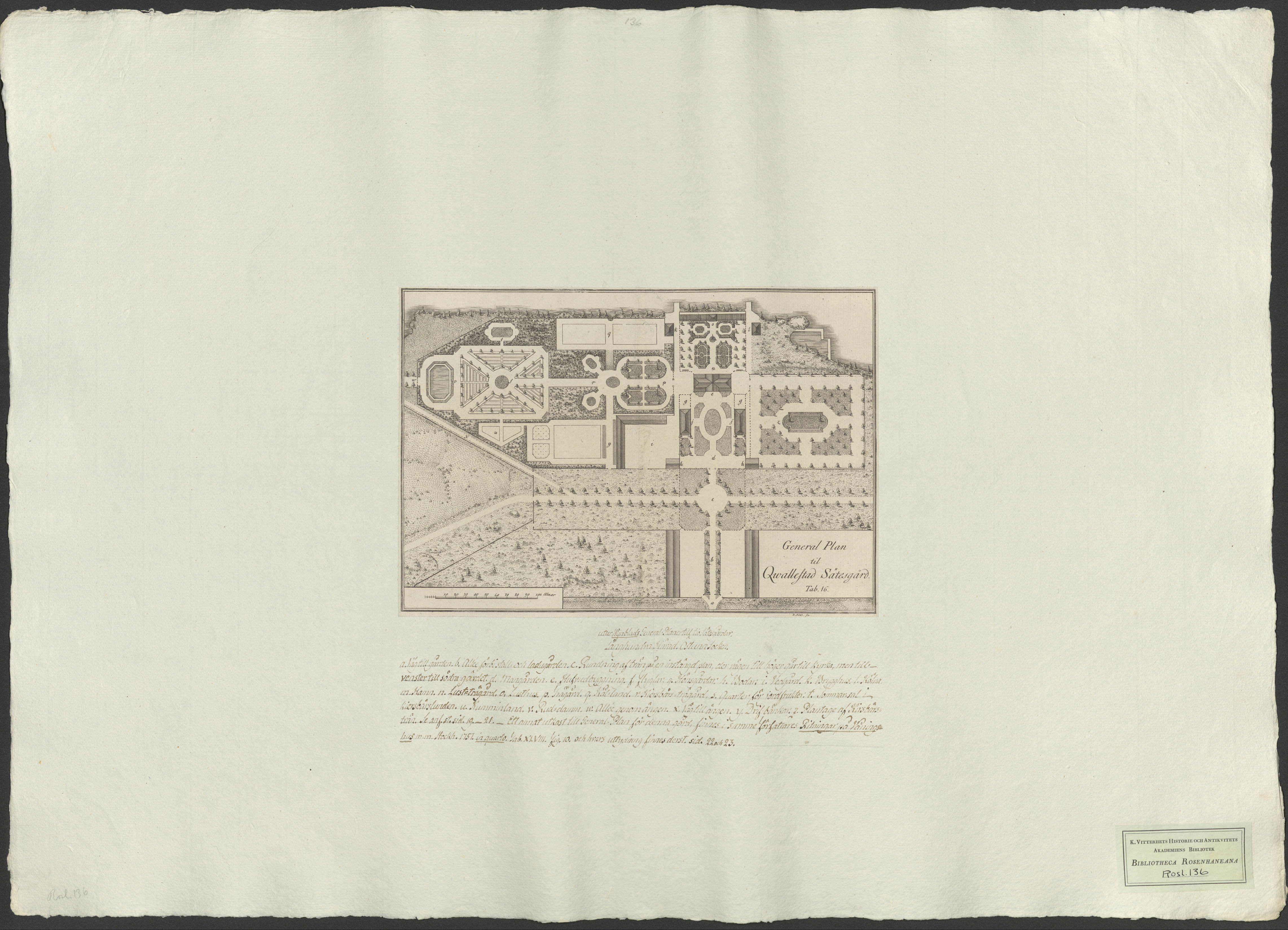 Beskrivning: 1 grafiskt bl. : Plan över byggnader och trädgård. Skala 1 cm = ca 14 alnar.