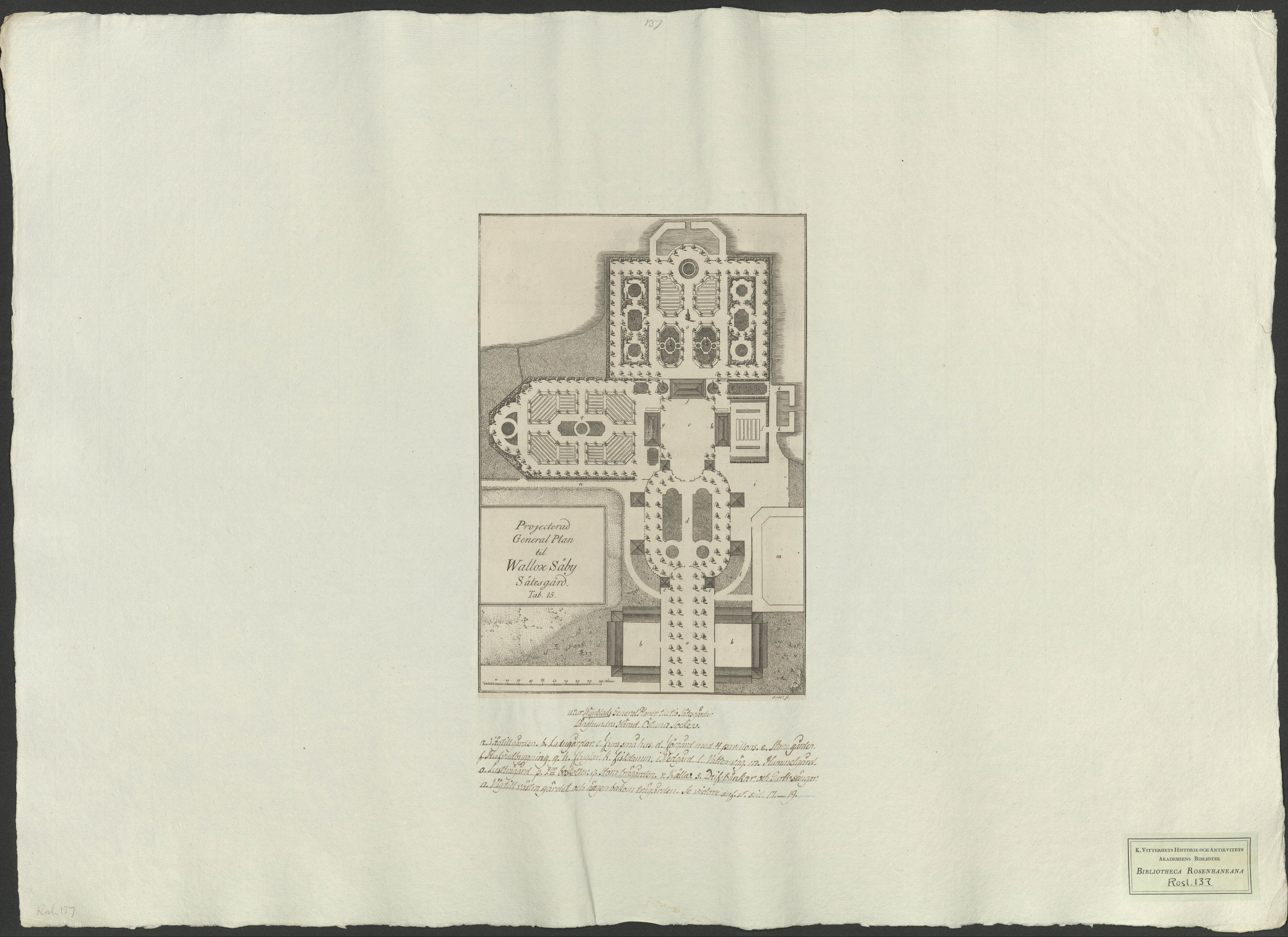 Beskrivning: 1 grafiskt bl. : Plan över byggnader och trädgård. Skala 1 cm = ca 14 alnar. O.G.W. Sculp.