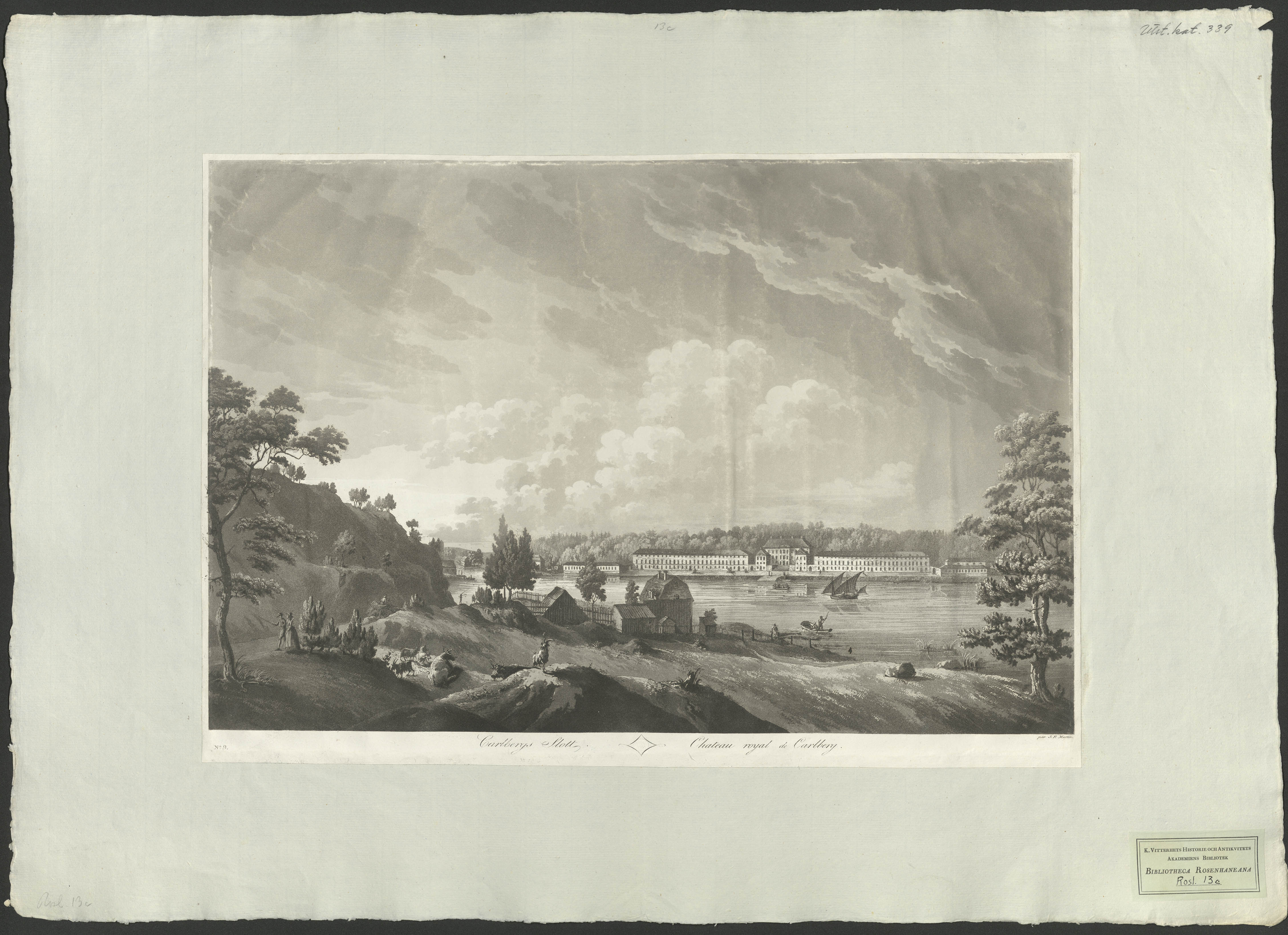 Beskrivning: 1 grafiskt bl. : Utsikt från Kungsholmen mot Karlbergs slott. par J. F. Martin