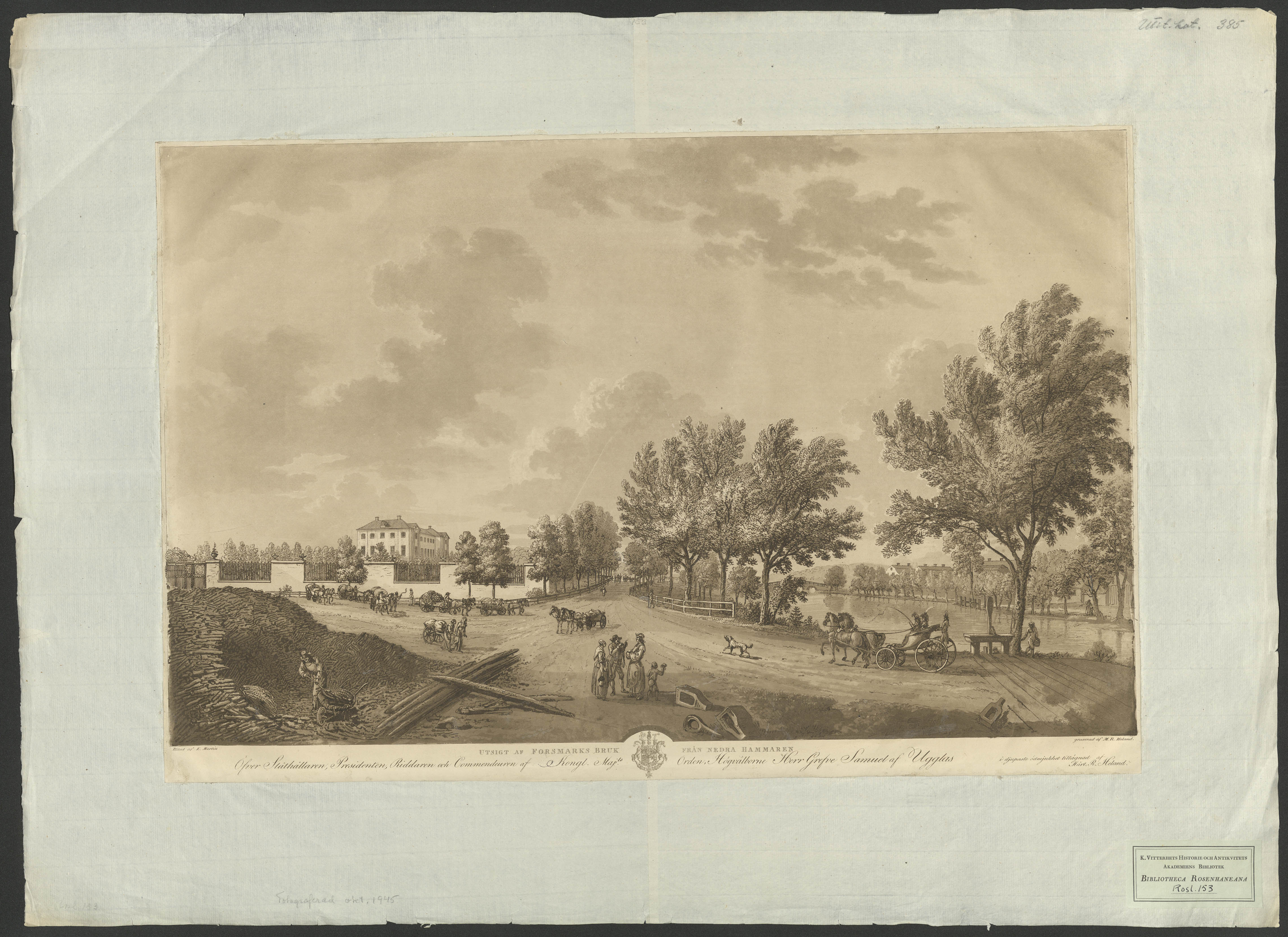 Beskrivning: 1 grafiskt bl. : I förgrunden landsvägen samt en man som lastar en skottkärra med kol. Bruksherrgården i bakgrunden. Ritad af E. Martin. ; graverad af M. R. Heland.