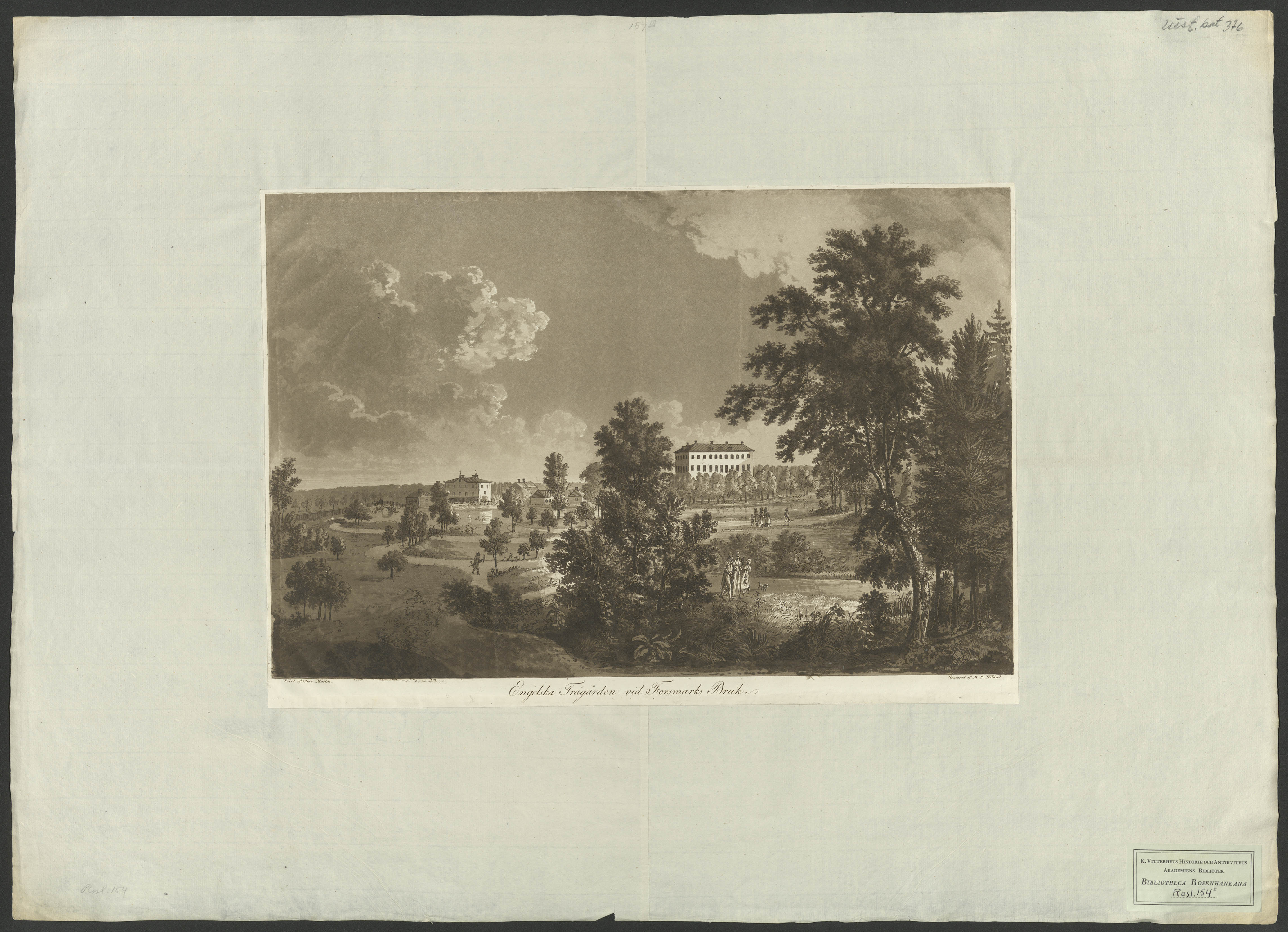 Beskrivning: 1 grafiskt bl. : Utsikt från en höjd över bruksherrgården som ligger till höger i bild. En annan byggnad till vänster i bild. I förgrunden ett spatserande sällskap. Ritad af Elias Martin ; Graverad af M. R. Heland.